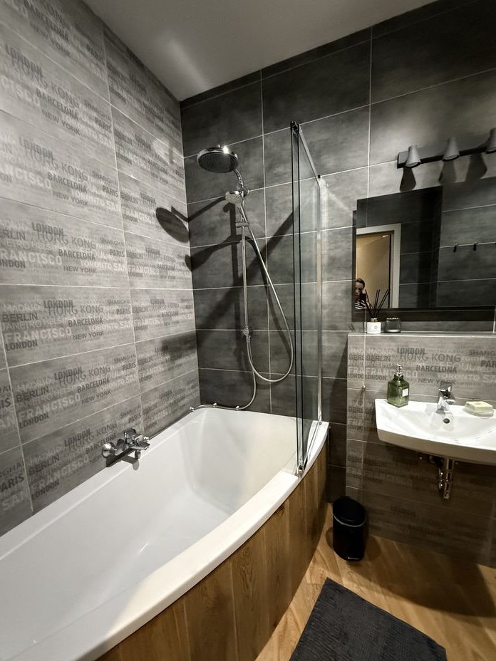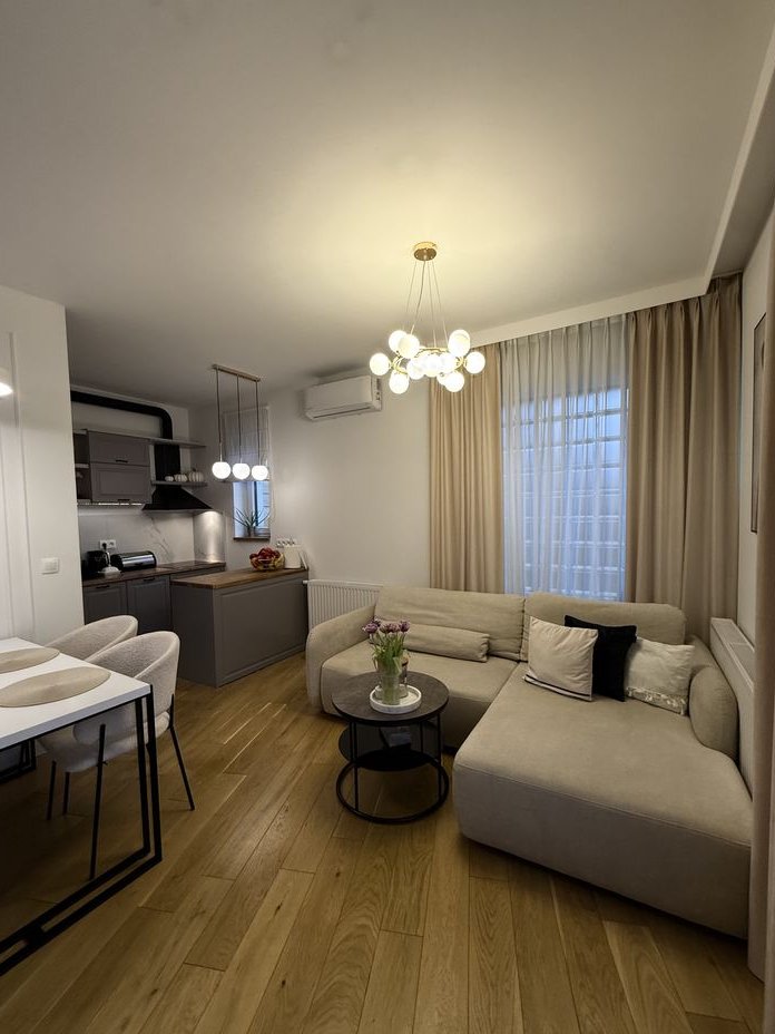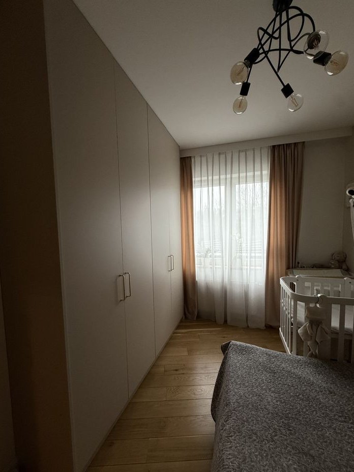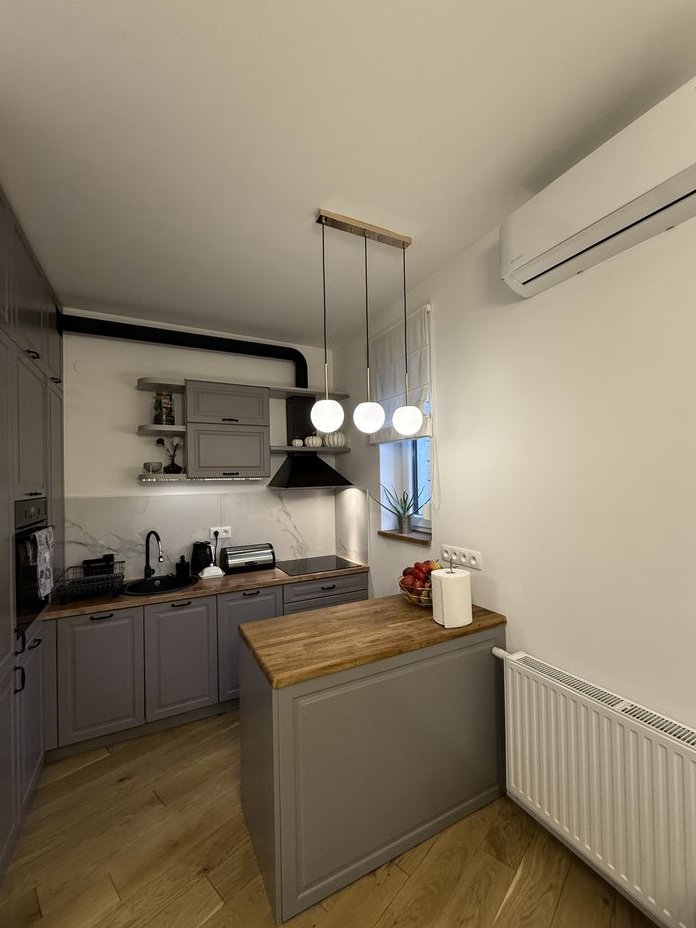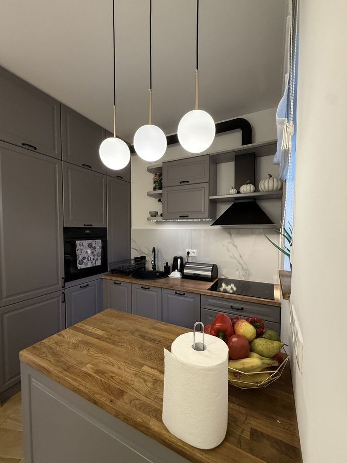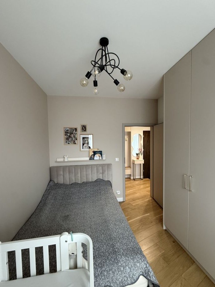 Mieszkanie przeszło niedawno remont. Wszystkie meble wykonano w zabudowie, aby maksymalnie wykorzystać przestrzeń i zapewnić dużo miejsca do przechowywania. Na podłodze znajduje się drewniana deska, a komfort podnoszą klimatyzacja oraz biokominek. Wnętrze jest jasne, przestronne i bardzo funkcjonalne.
