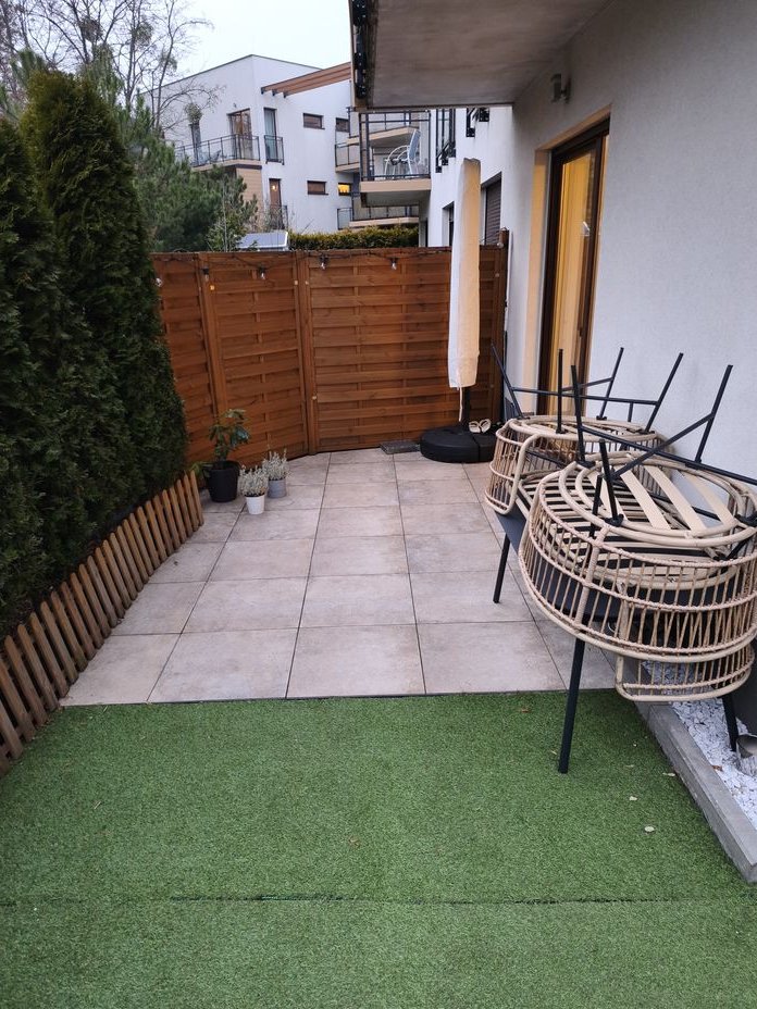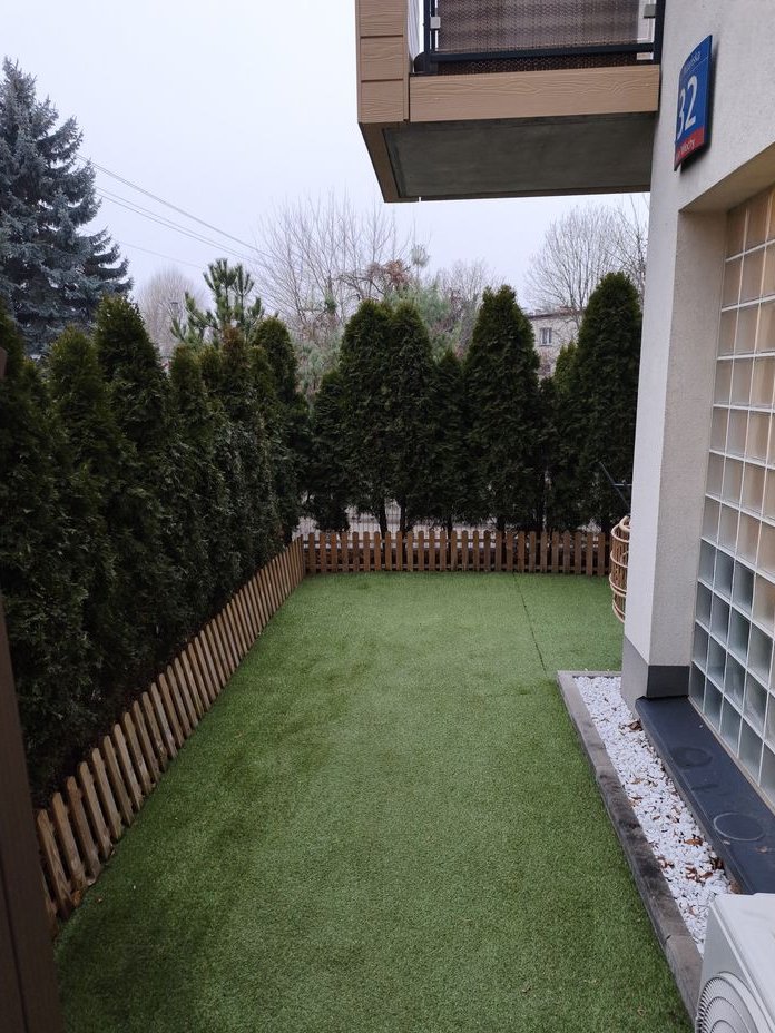 Ogromnym atutem jest zaciszny ogródek o powierzchni ok. 40 m², w kształcie litery "L", co daje naturalny podział na część wypoczynkową i "roboczą". Ogródek wyposażony jest w meble ogrodowe, parasol oraz domek narzędziowy. Otaczające go tuje zapewniają pełną prywatność, a położenie na skraju budynku sprawia, że do ogródka nie zaglądają sąsiedzi z innych balkonów.