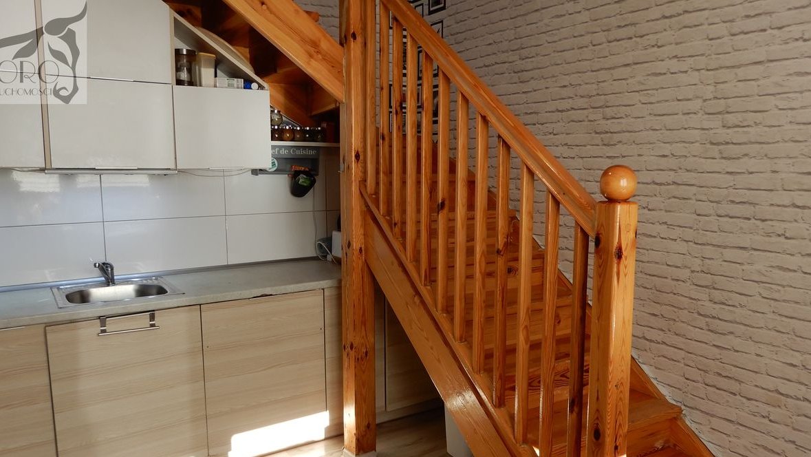 Na parterze budynku znajduje się przestronny salon, kuchnia, łazienka, przedpokój i drewniane schody. Na piętrze znajduje się salon i dwie sypialnie w tym jedna z balkonem (około 1,5 m2). Wykończenie podłóg: panele i terakota. Wykończenie ścian: gipsówki, glazura, tapety, tynk mozaikowy. Sufity są częściowo podwieszane. W kuchni znajdują się meble na wymiar w zabudowie ze zmywarką, piekarnikiem, płytą gazową, lodówka. W łazience znajduje się wanna, umywalka z szafką, szafka. W przedpokoju znajduje się szafa typu komandor. W łazience i przedpokoju jest ogrzewanie podłogowe. Wystawa okien jest na południe i zachód. Stolarka okienna jest PCV.