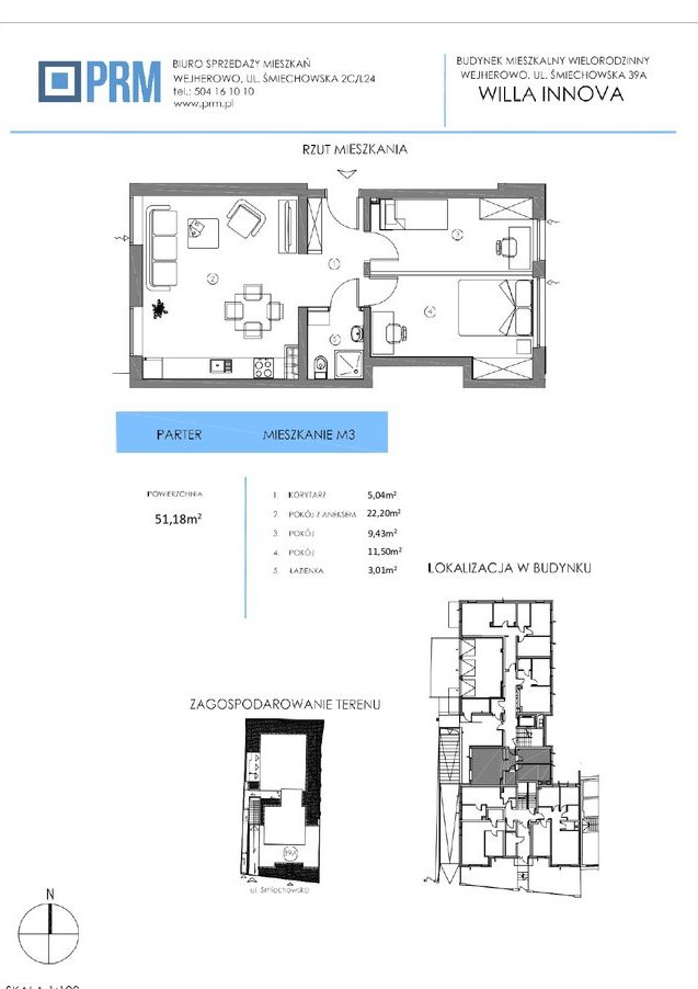 Na sprzedaż nowe, 3-pokojowe mieszkanie o powierzchni 51,18 m², położone na parterze kameralnego budynku w inwestycji Willa Innowa, zlokalizowanej w samym centrum Wejherowa.