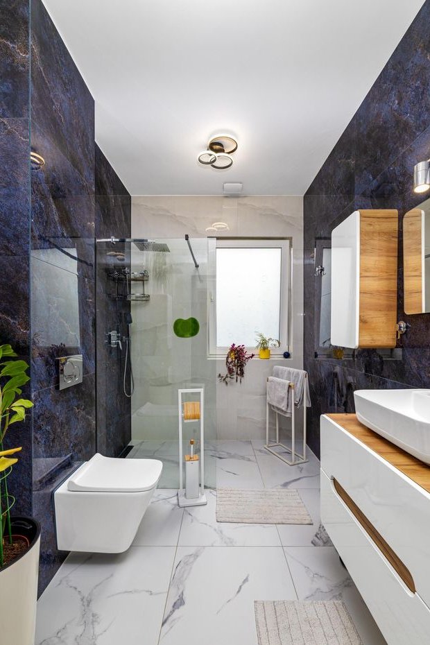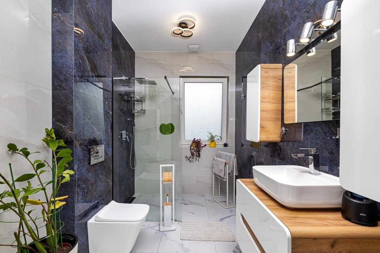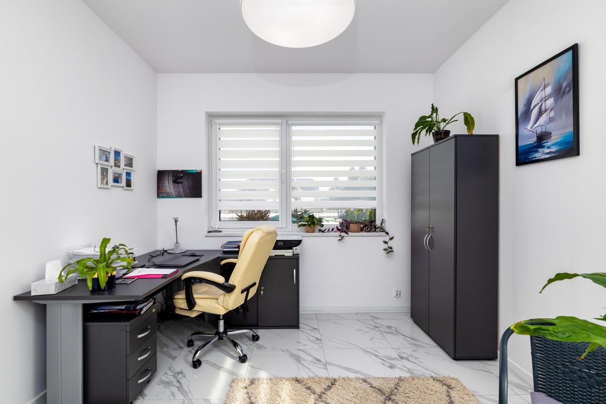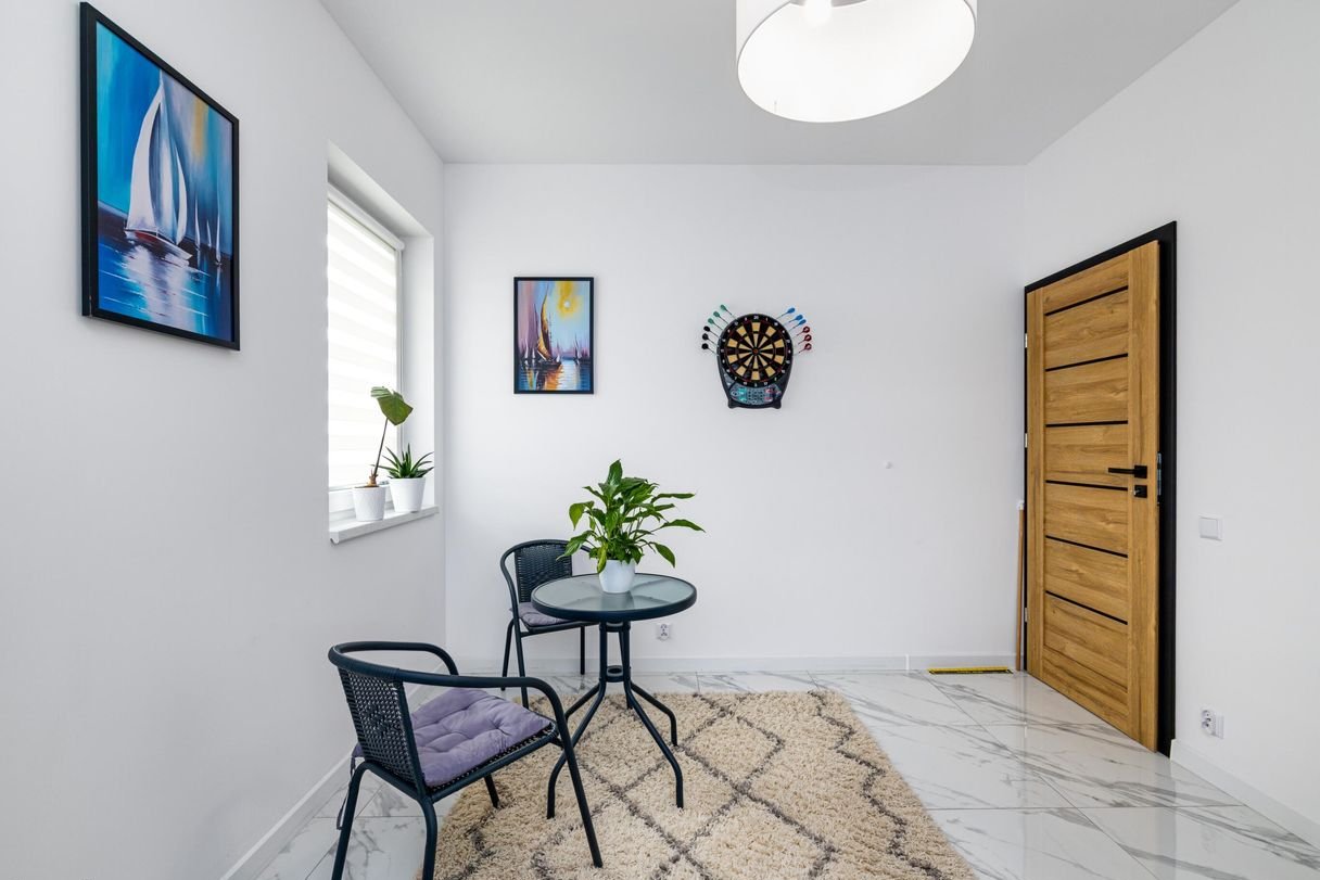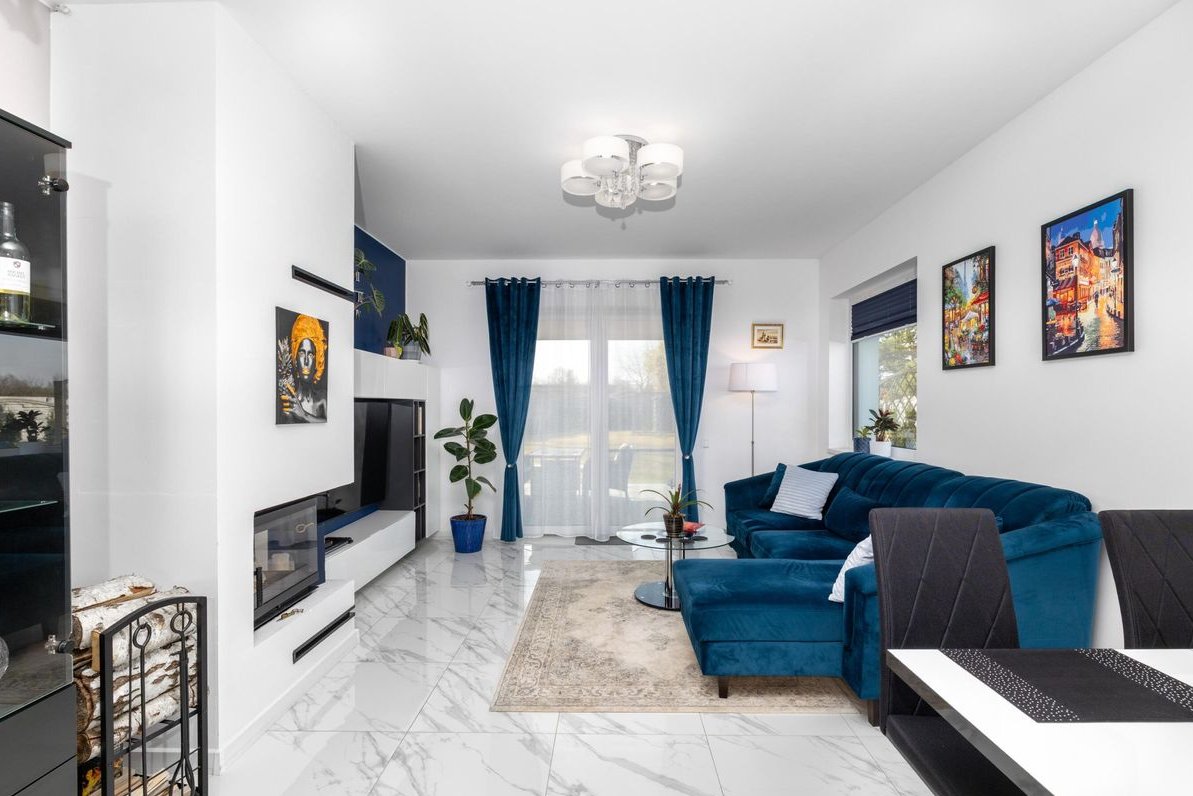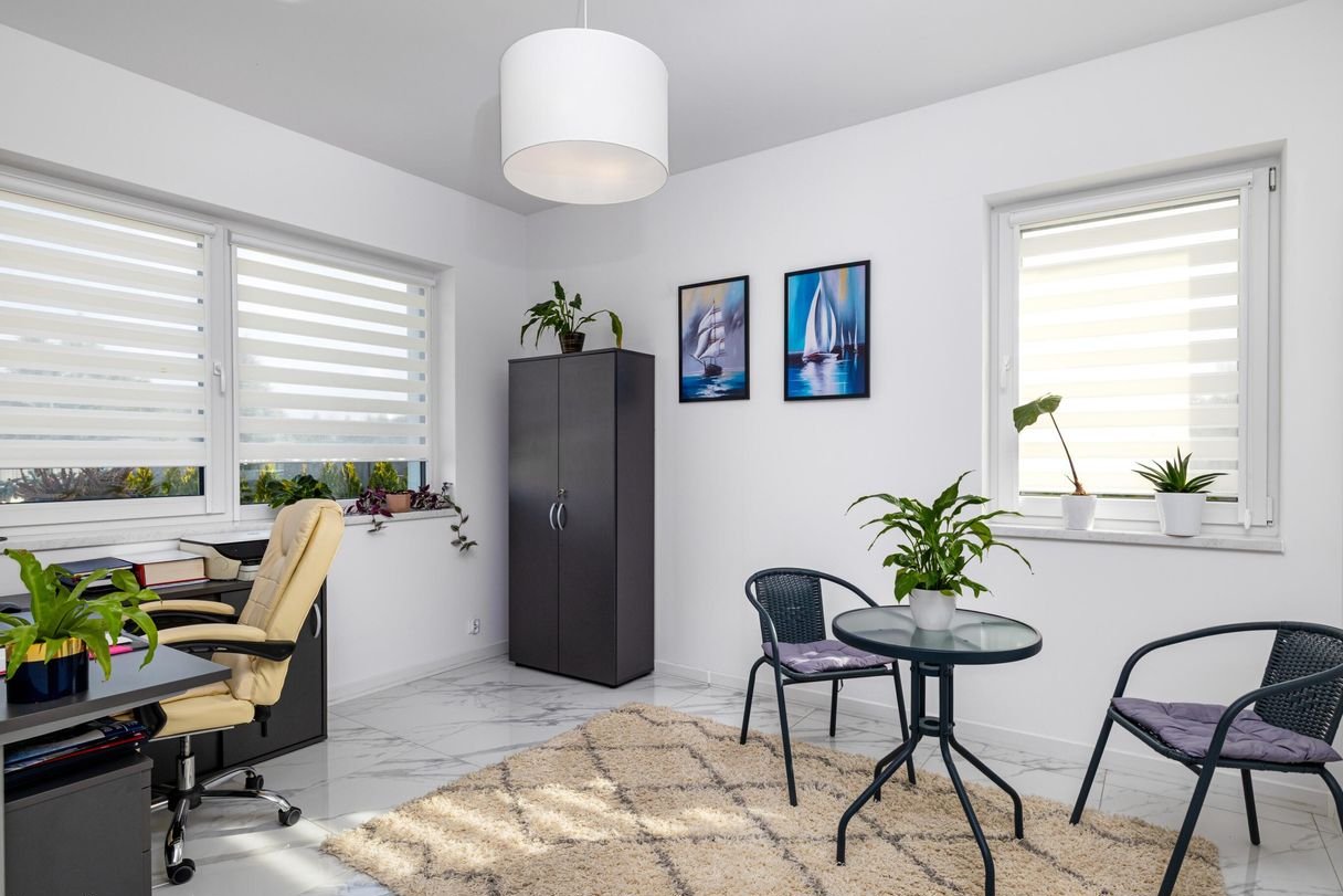 Podłogi wykończone gresem wysokiej jakości. Rolety dzień/noc w całym domu.