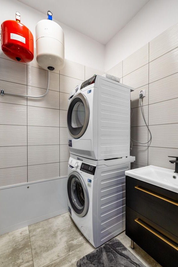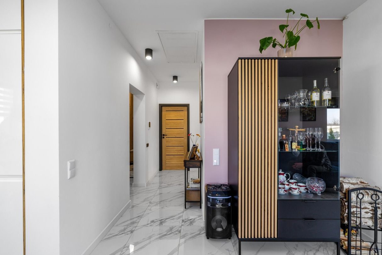 Kotłownia z suszarnią oraz przestronny przedpokój w zabudowie.
