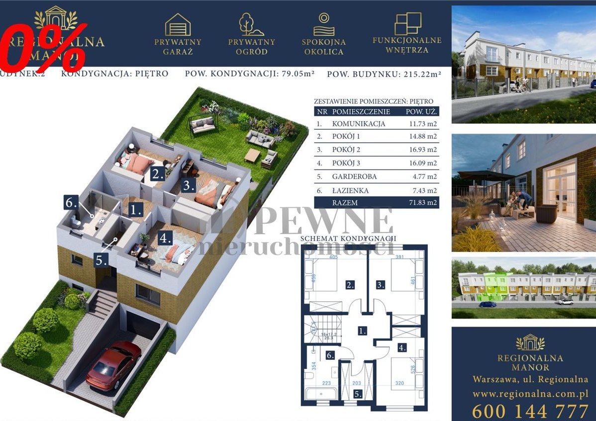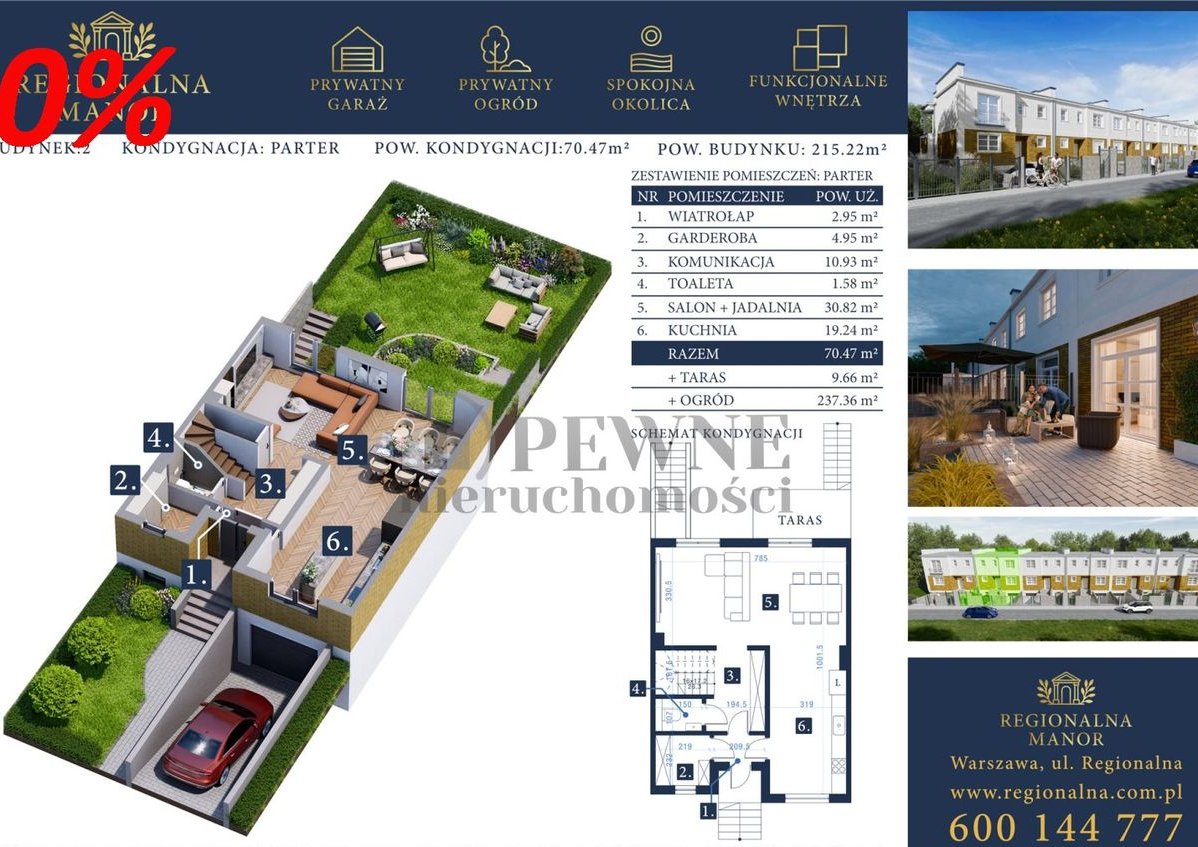 Dom w inwestycji Regionalna Manor oferuje przestronne wnętrza o powierzchni 215 m². Budynek został zaprojektowany i zbudowany z dbałością o najdrobniejsze szczegóły, z wykorzystaniem nowoczesnych technologii i materiałów najwyższej jakości. Budynki są wykonane w wysokim standardzie deweloperskim, co daje Ci pełną swobodę w aranżacji wnętrz według własnych upodobań, gwarantując jednocześnie solidne wykonanie. Przemyślane układy pomieszczeń zapewniają komfort i funkcjonalność na co dzień.Komfort i Prywatność z Zagospodarowanym Otoczeniem: