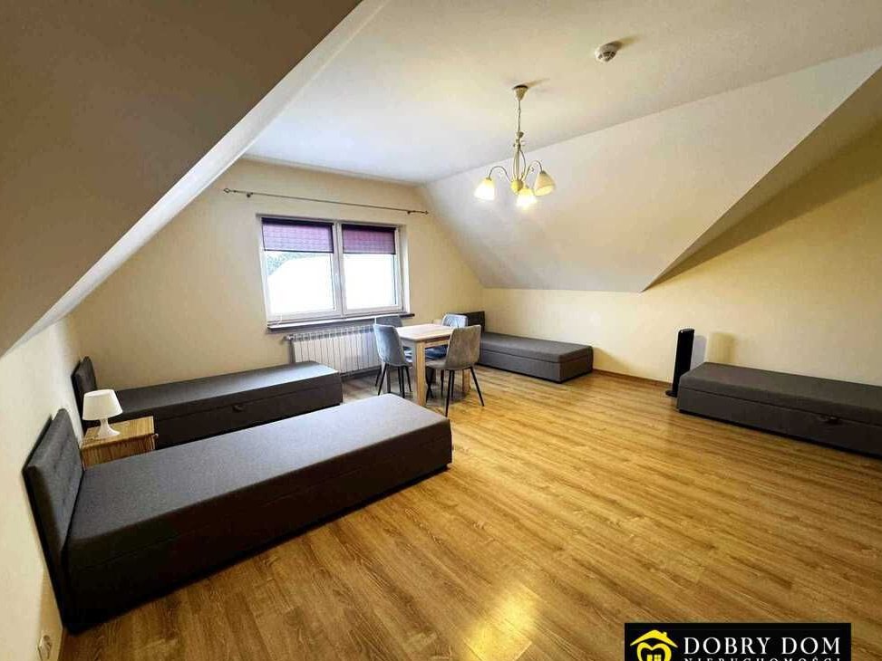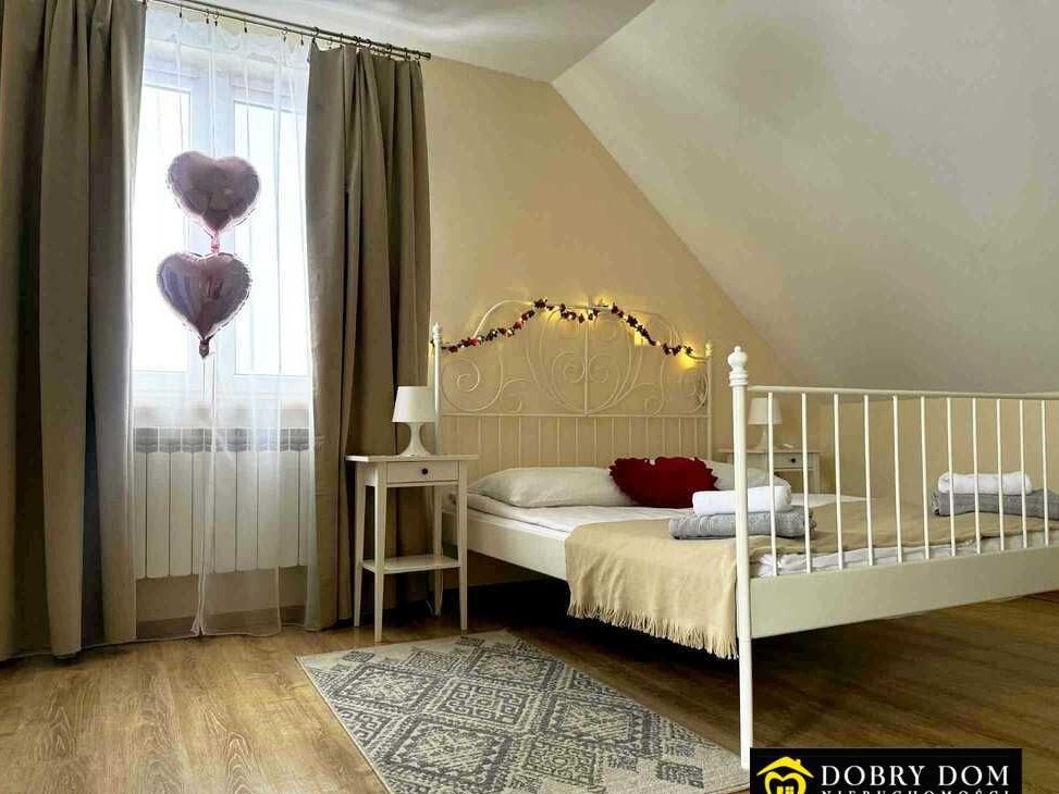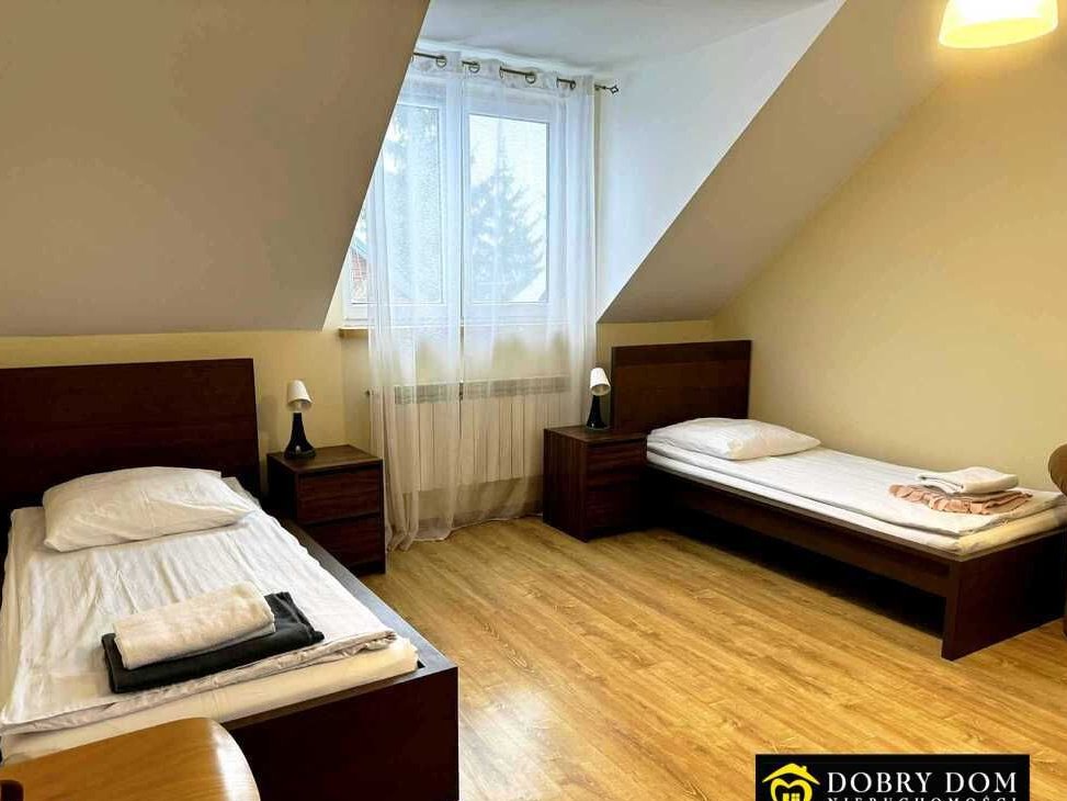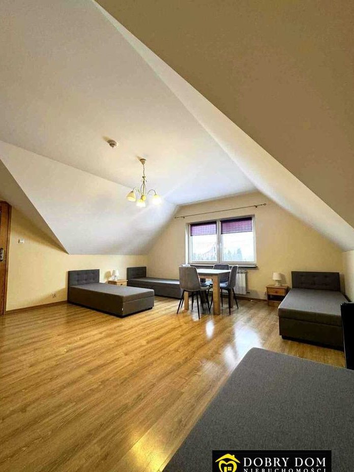 Na piętrze znajdują się 4 pokoje gościnne, łącznie dla 14–16 osób.