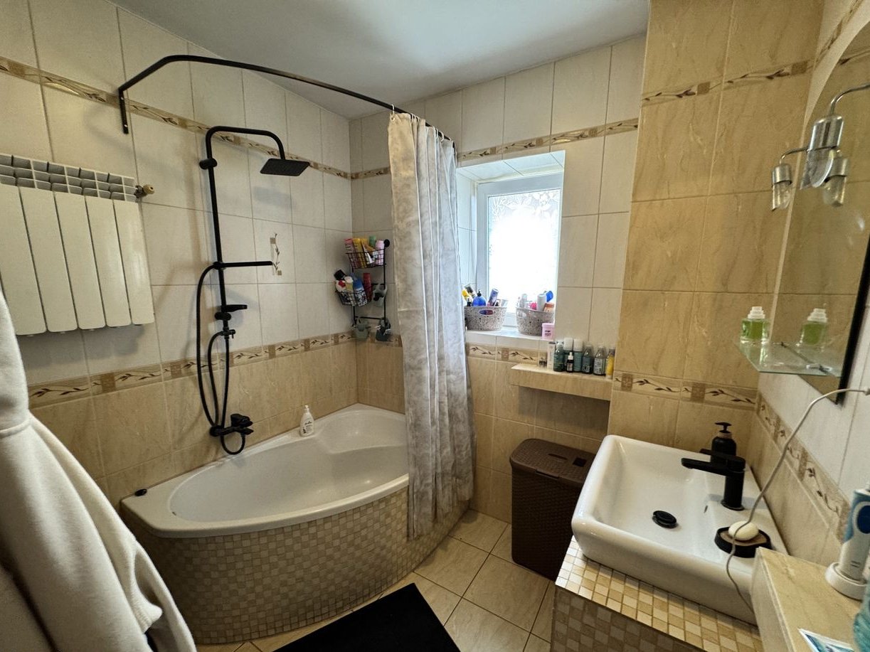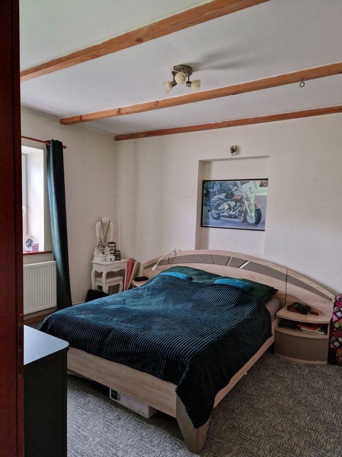 Ogrzewanie: kominek z płaszczem wodnym + grzejniki w każdym pomieszczeniu prócz wc i salonu. Zużycie drewna na sezon: 8–10 m³ - jest bardzo niewielkie i świadczy o dobrej termice domu.