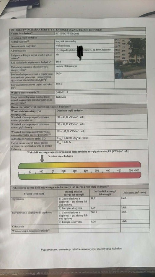 Certyfikat energetyczny: Posiadam aktualne Świadectwo Charakterystyki Energetycznej ze znakomitym wynikiem dla tego typu budownictwa (Wskaźnik EP = 107,01 kWh/(m²·rok) – zielone pole), co urzędowo potwierdza bardzo niskie zapotrzebowanie na energię.