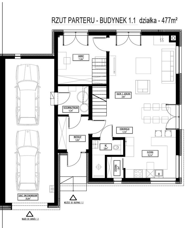 Wnętrza, zaprojektowane z dbałością o funkcjonalność i komfortWykończenie materiałami wysokiej jakości (elewacja częściowo zabudowanymi płytek, okna energooszczędne, przygotowana instalaca pod fotowoltaikę)