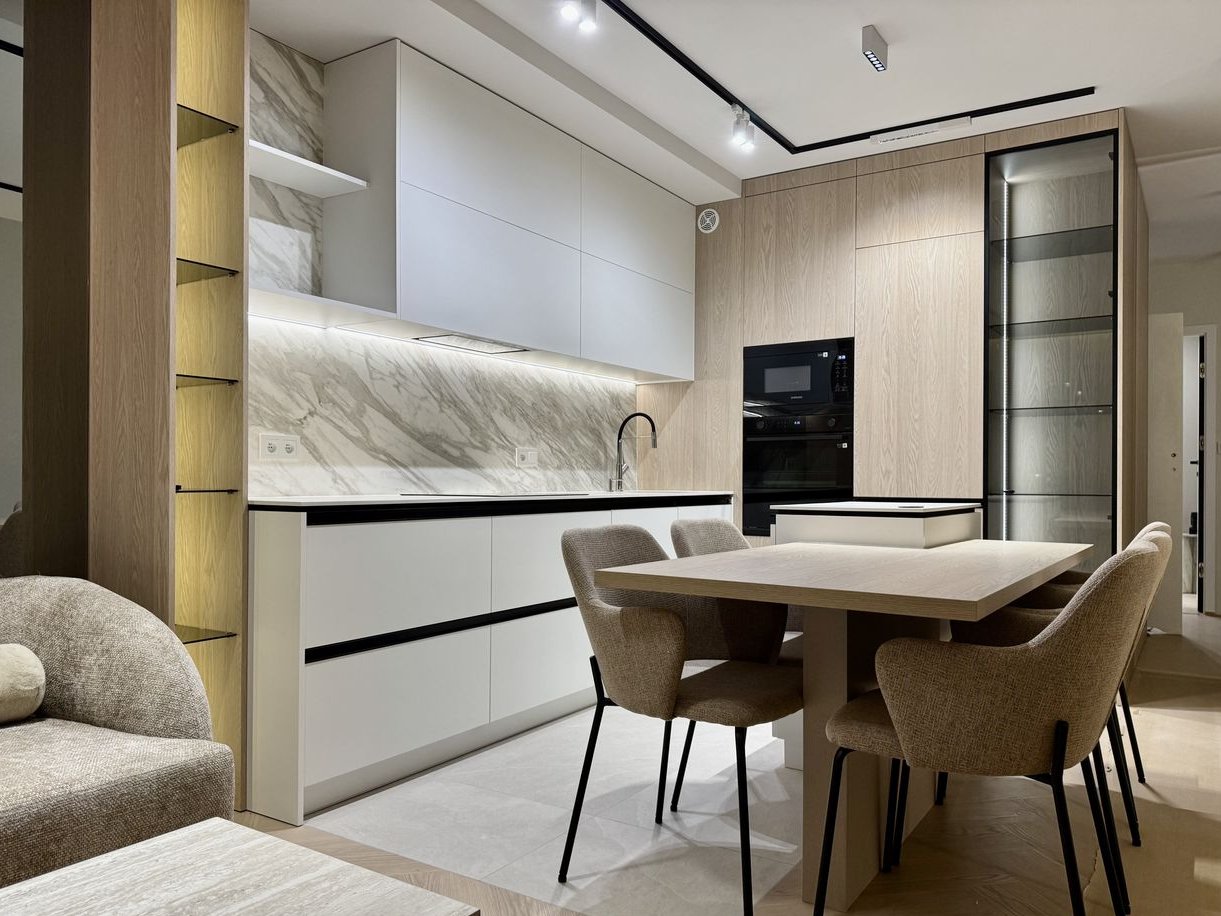 Wszystkie zabudowy meblowe w apartamencie, zostaną wykonane przez profesjonalną firmę stolarską, na systemach BLUM