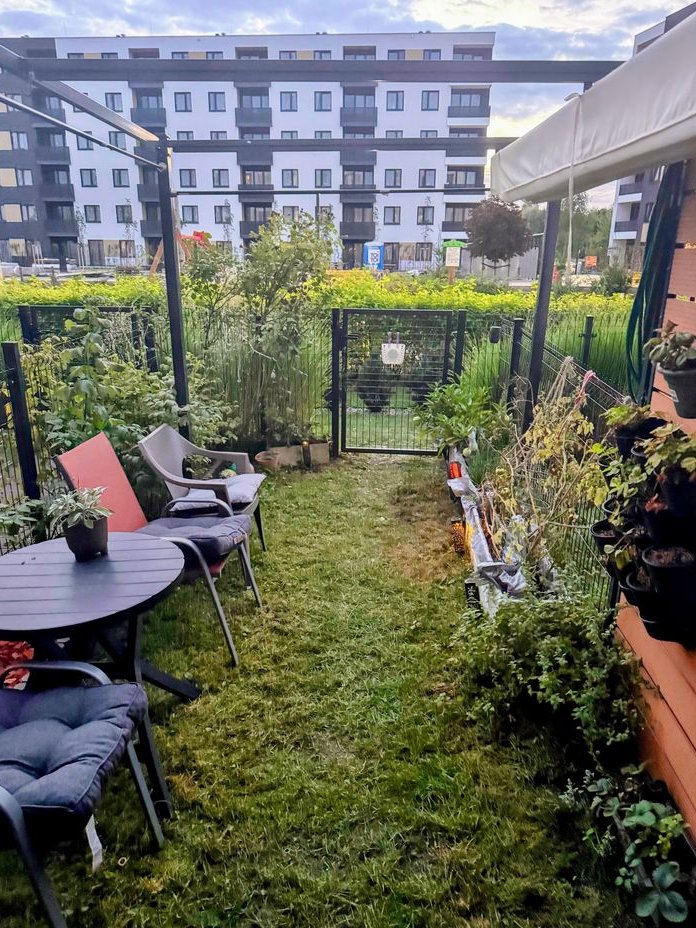 Dwa ogródki: wschodni od parkingu - ułatwia wniesienie dużych zakupów do domu, a zachodni ma zadaszoną wnękę oraz dodatkową bramkę, co ułatwia wyjście na rower lub spacer z dziećmi na pobliski plac zabaw – praktyczne rozwiązanie dla osób aktywnych.