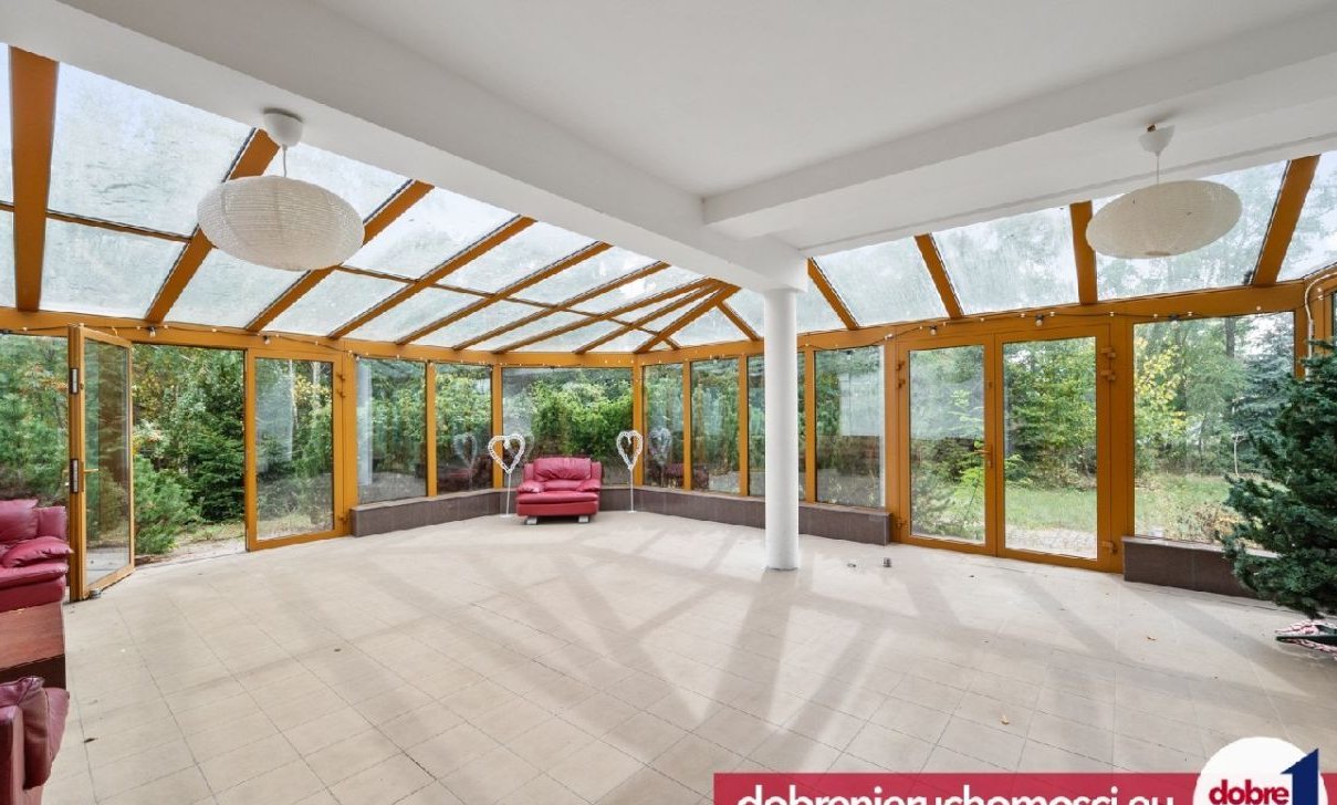 -pokój dzienny (38,18 m²) z jadalnią (20,53 m²) z wyjściem na ogród zimowy (46,65 m²) – całoroczną oazę spokoju,