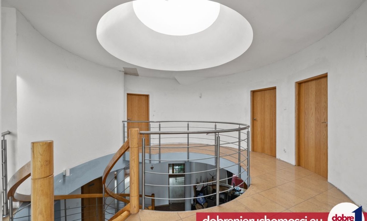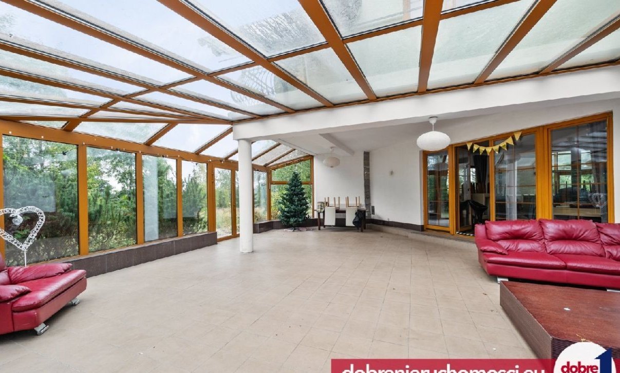 -przestronny hol (66,20 m²) ze szklanym sufitem, hol pełni funkcję pokoju widokowego z dużym przeszkleniem, które daje możliwość podziwiania w bardzo szerokim -niczym niezasłoniętym widnokręgu- pięknej natury za oknem,