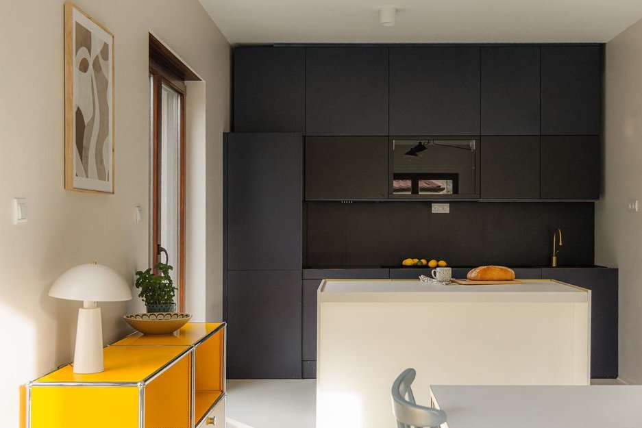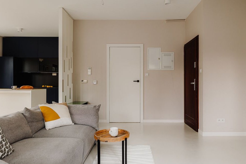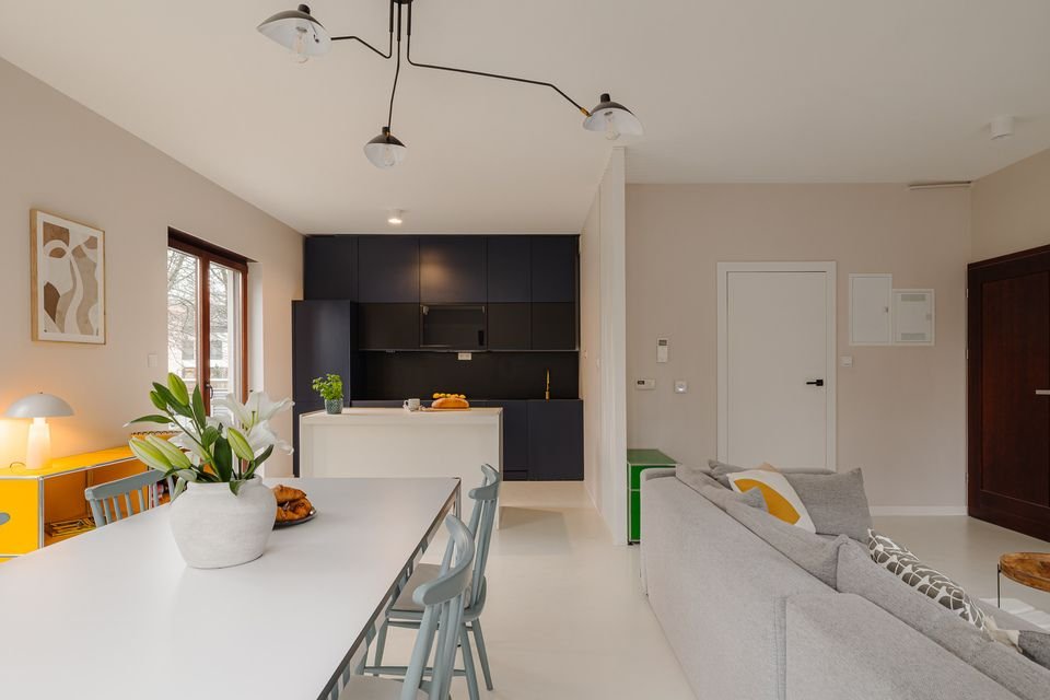 Centralnym punktem mieszkania jest przestronny salon połączony z aneksem kuchennym, które razem tworzą imponującą, otwartą przestrzeń o powierzchni aż 45 mkw. Duże przeszklenia, widok na ogród oraz bezpośrednie wyjścia na oba tarasy sprawiają, że ta część mieszkania jest nie tylko doskonale doświetlona, ale też niezwykle funkcjonalna. Starannie zaprojektowana zabudowa kuchenna z wyspą wykonana na wymiar i wyposażona we wszystkie niezbędne sprzęty dopełnia całość.