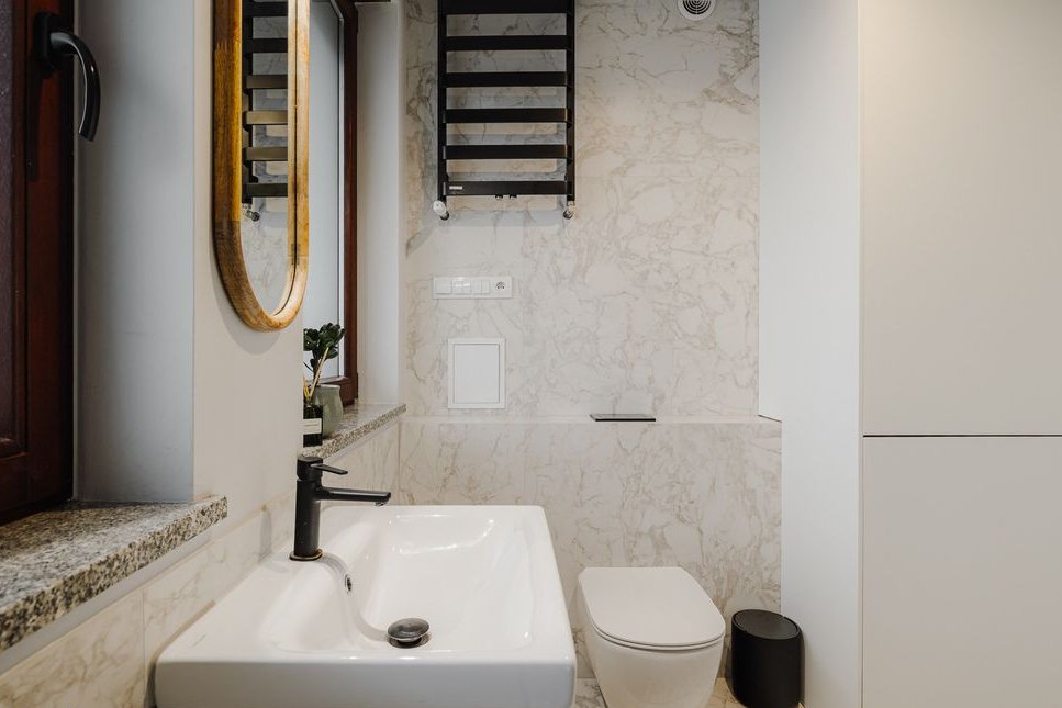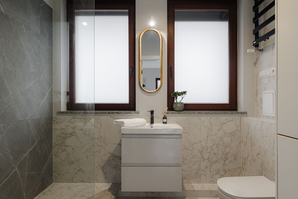 Łazienka jasna, w dwoma oknami, które zapewniają naturalne doświetlenie przez cały dzień. Pomieszczenie jest w pełni wykończone, utrzymane w stonowanej, eleganckiej stylistyce i zaprojektowane z myślą o funkcjonalności.