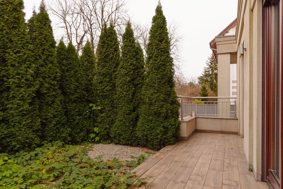 dwa tarasy, w tym jeden z kameralnym ogródkiem obsadzonym tujami