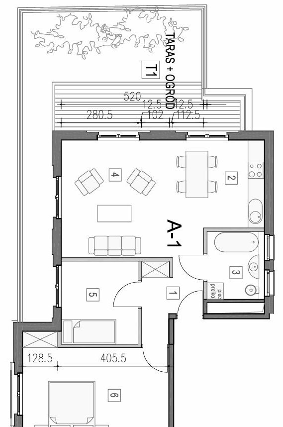 Obecnie 2 pokoje, jednak istnieje bardzo łatwa możliwość przywrócenia układu 3-pokojowego zgodnie z pierwotnym projektem.