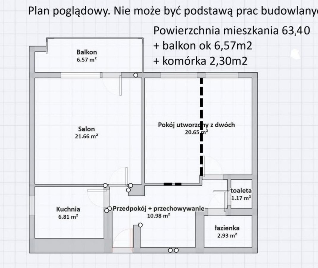 Lokal pierwotnie 3-pokojowy, obecnie 2-pokojowy – z możliwością łatwego przywrócenia układu 3 pokoi.