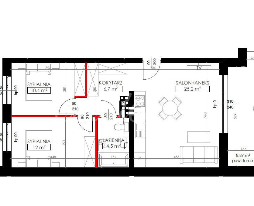 * przestronny salon z aneksem kuchennym, częścią jadalnianą i wypoczynkową (25,20 m2)