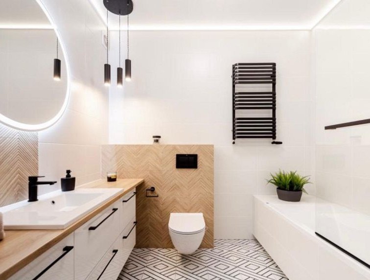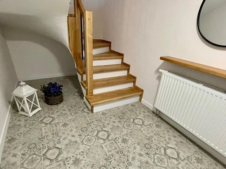 ogrzewanie podłogowe w łazienkach oraz w aneksie kuchennym.