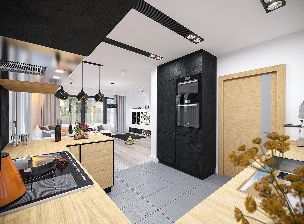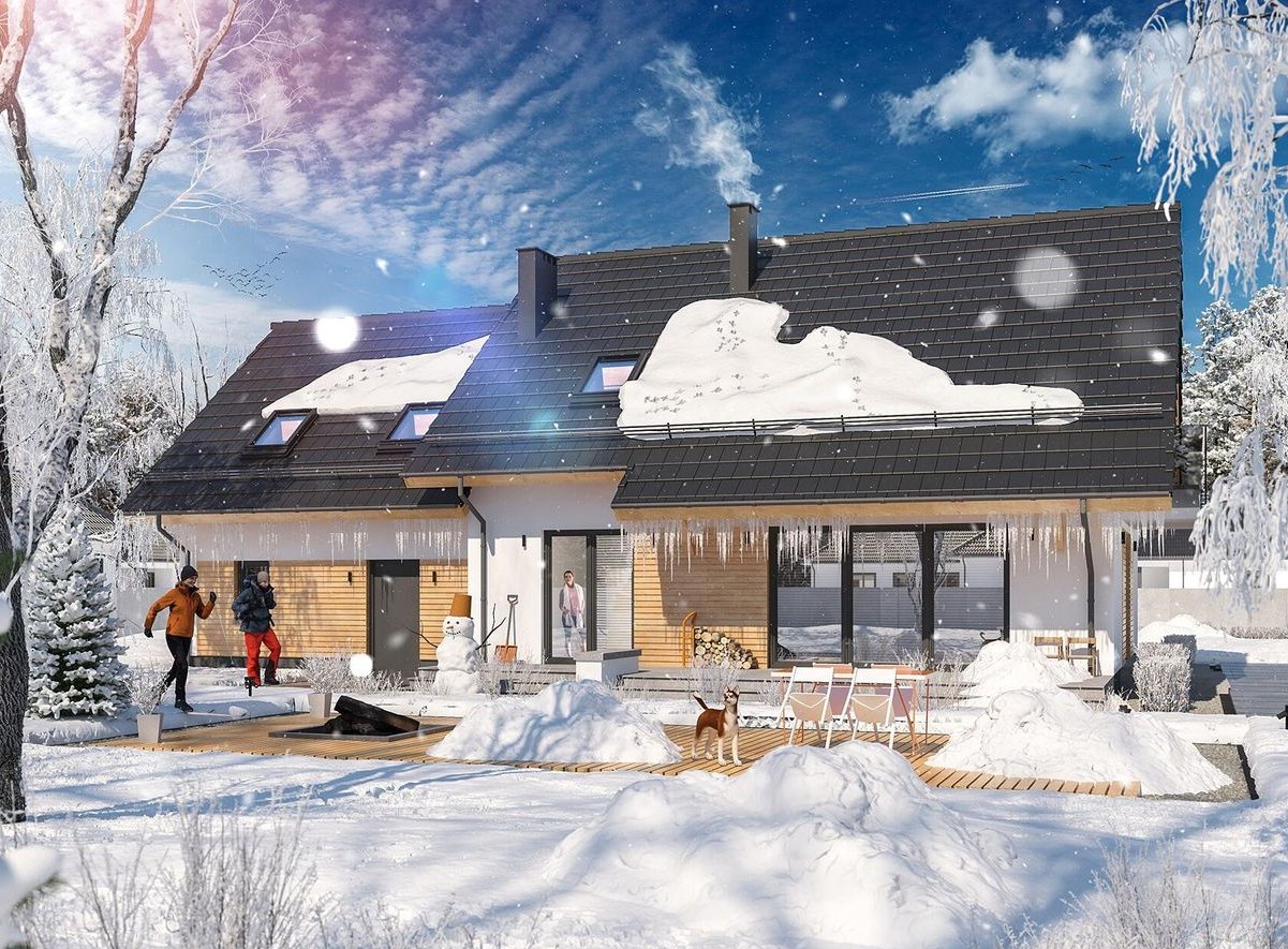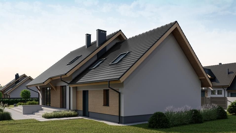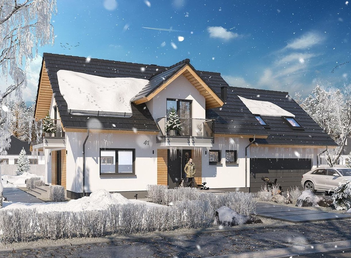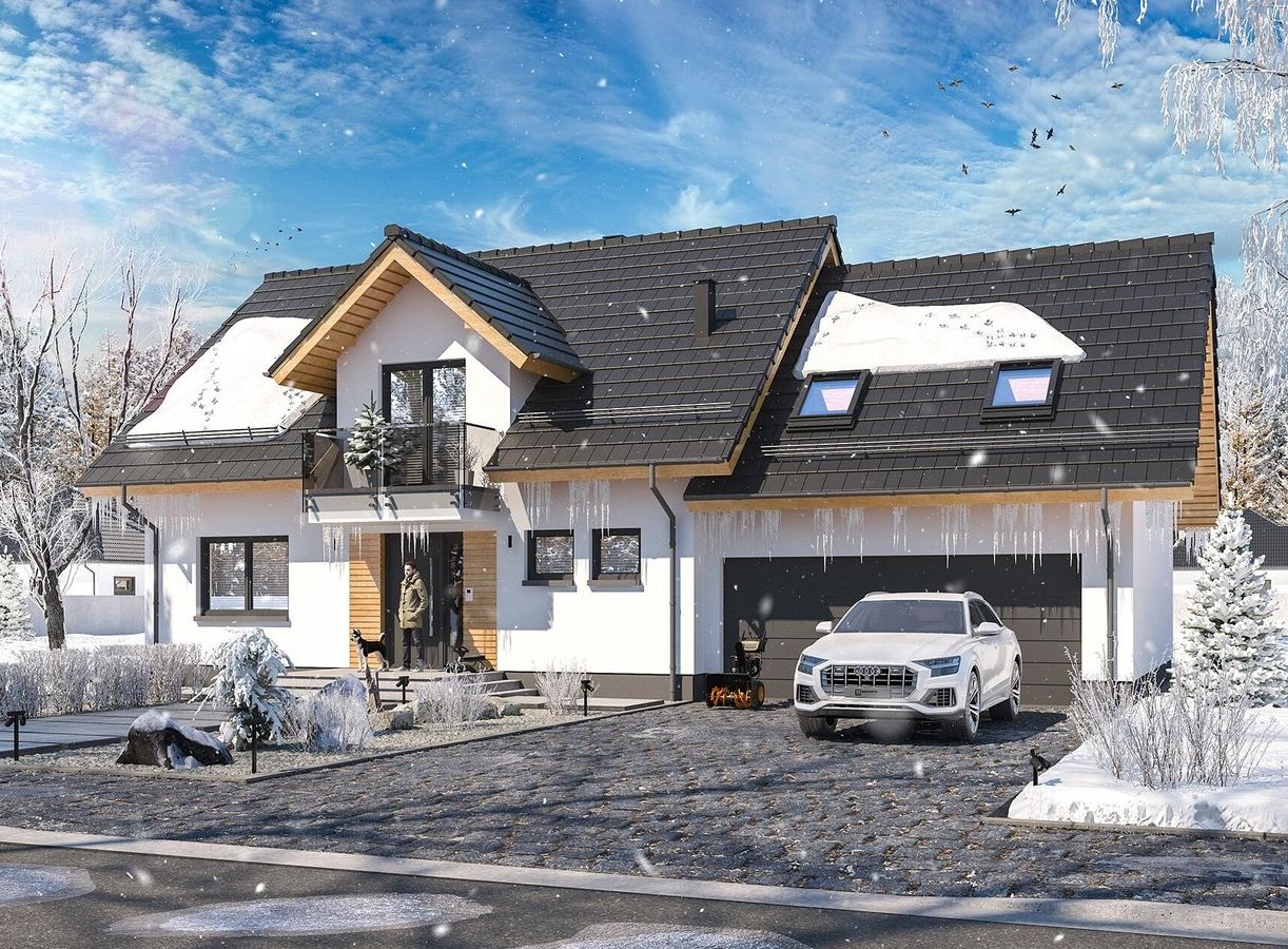 - Dach z czarnej dachówki ceramicznej idealnie komponuje się z jasną elewacją oraz elementami drewnianymi.