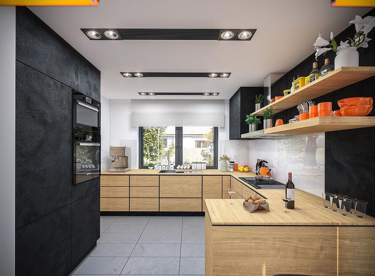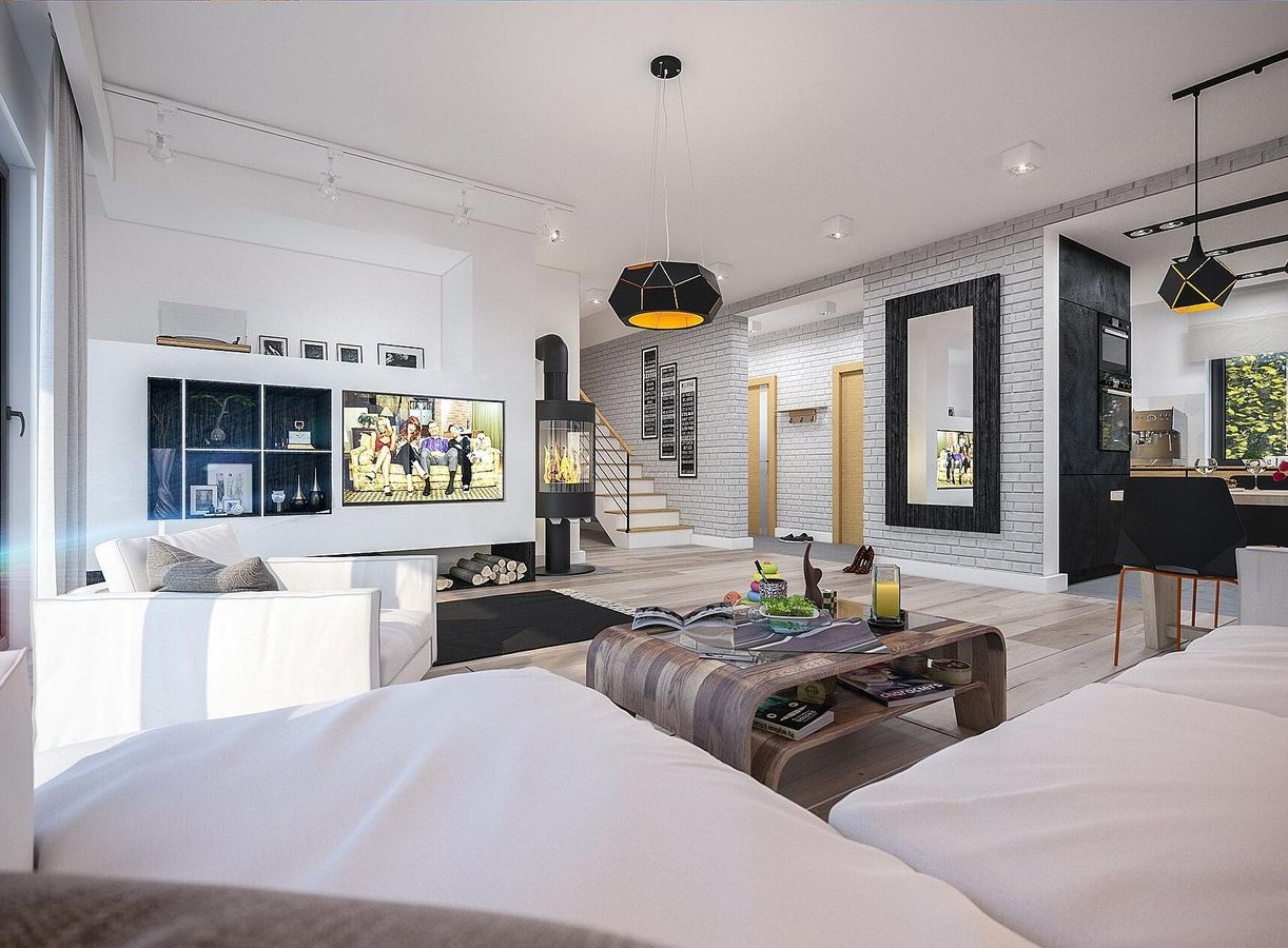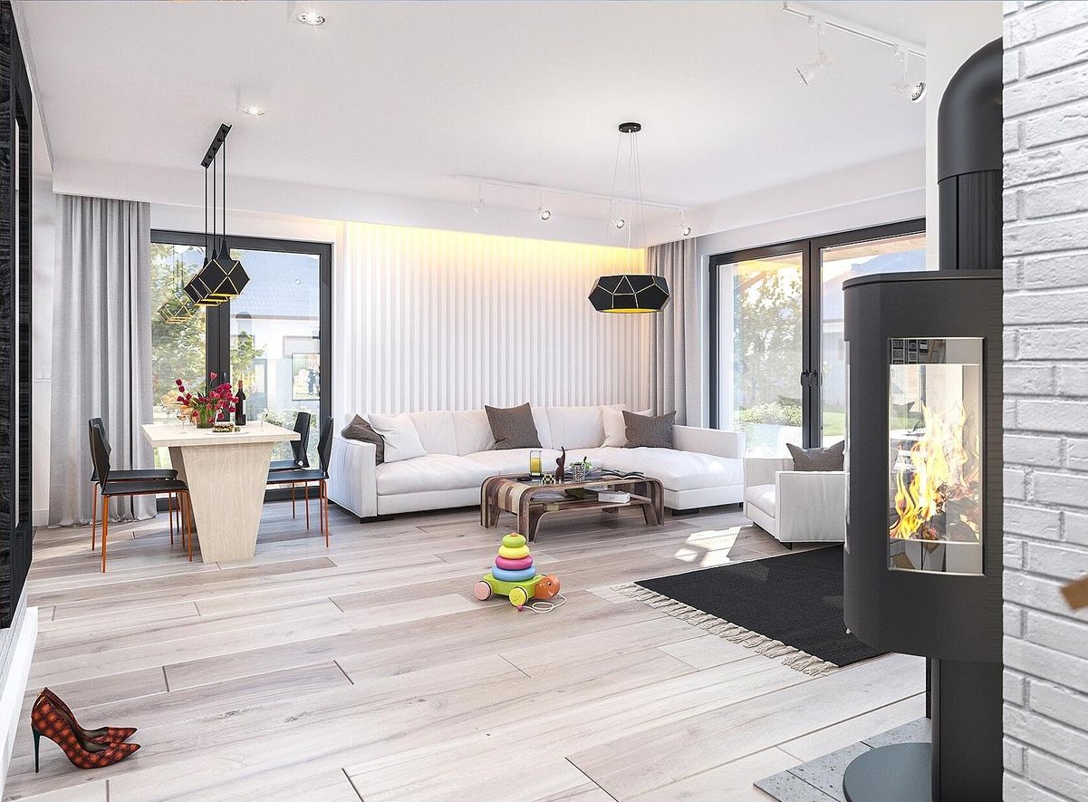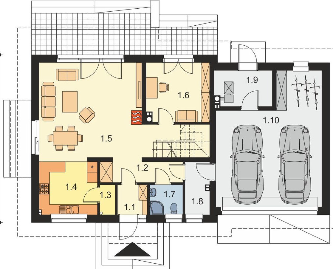 - Na parterze domu znajduje się przestronny, dobrze oświetlony salon, o powierzchni powyżej 32 m², sąsiaduje z nim dodatkowy pokój, który można przeznaczyć na gabinet lub pokój gościnny. Otwarta kuchnia z praktyczną spiżarnią może być oddzielona, w razie potrzeby, od pokoju dziennego ścianką działową. Z przodu budynku znalazła się łazienka i pomieszczenie gospodarcze, przez które dostajemy się wprost do dwustanowiskowego garażu. W obrębie garażu wyodrębniono sporą kotłownię.