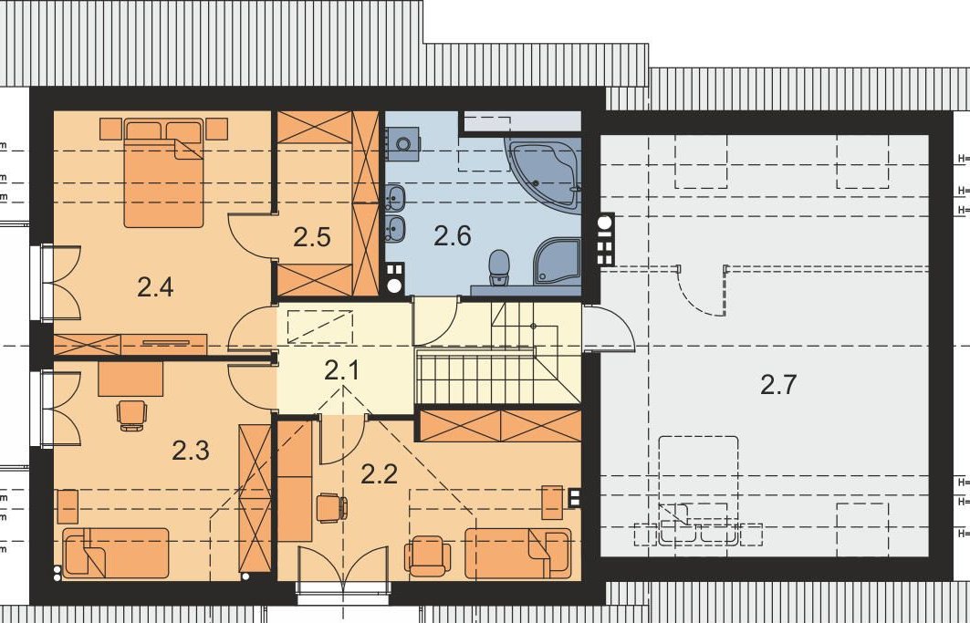 - Dodatkowo, nad garażem znajduje się duże pomieszczenie, które można zaadaptować na drugi salon, luksusową sypialnię lub miejsce zabaw dla najmłodszych.