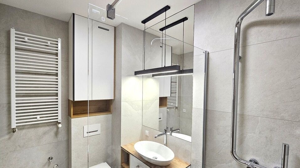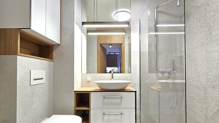 - ŁAZIENKA - z dużym lustrem, przeszklonym prysznicem, toaletą, miejscem na pralkę, szafkami na wymiar