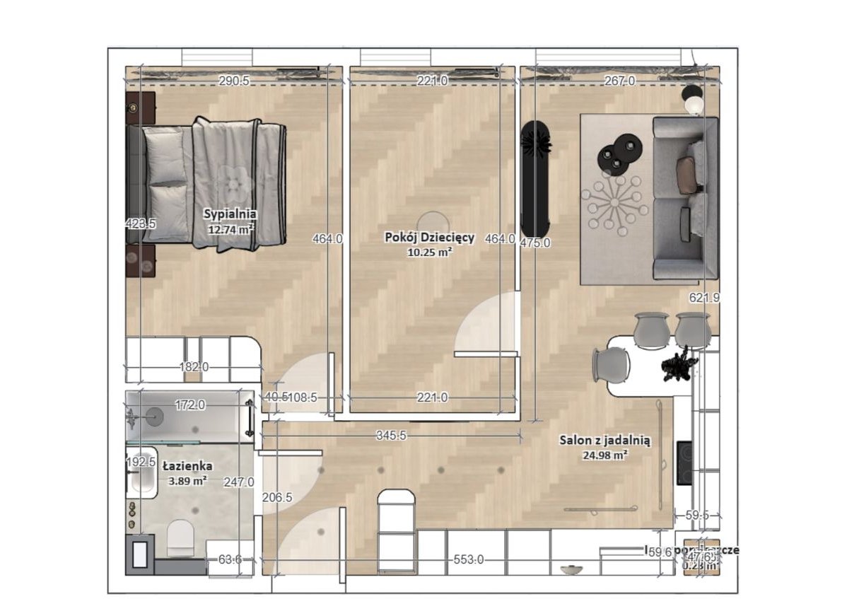 Układ: przestronny salon z aneksem kuchennym, sypialnia, pokój, elegancka łazienka, przedpokój