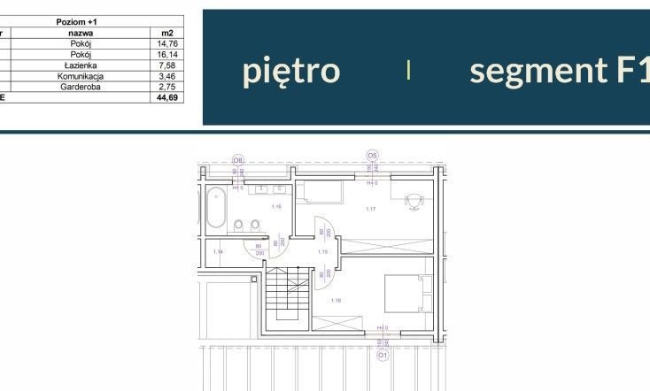 Na piętrze znajdują się 4 pomieszczenia: 2 sypialnie, łazienka oraz pomieszczenie gospodarcze. Sypialnie mają metraż około 14,7m2 oraz 16,1m2. W łazience bez problemu zmieści się wanna oraz prysznic. A pomieszczenie gospodarcze może służyć jako dodatkowa garderoba.