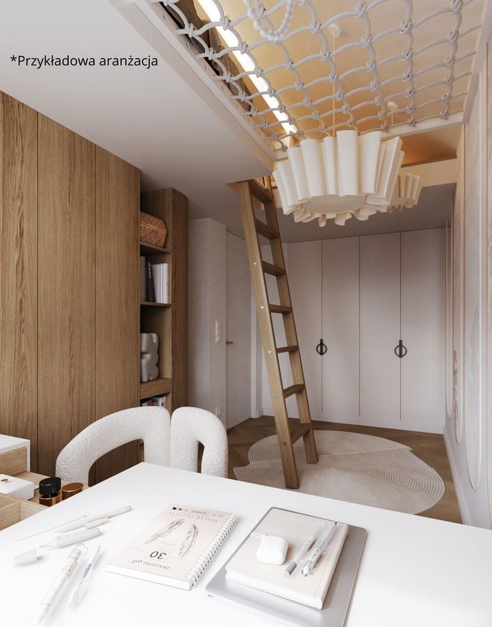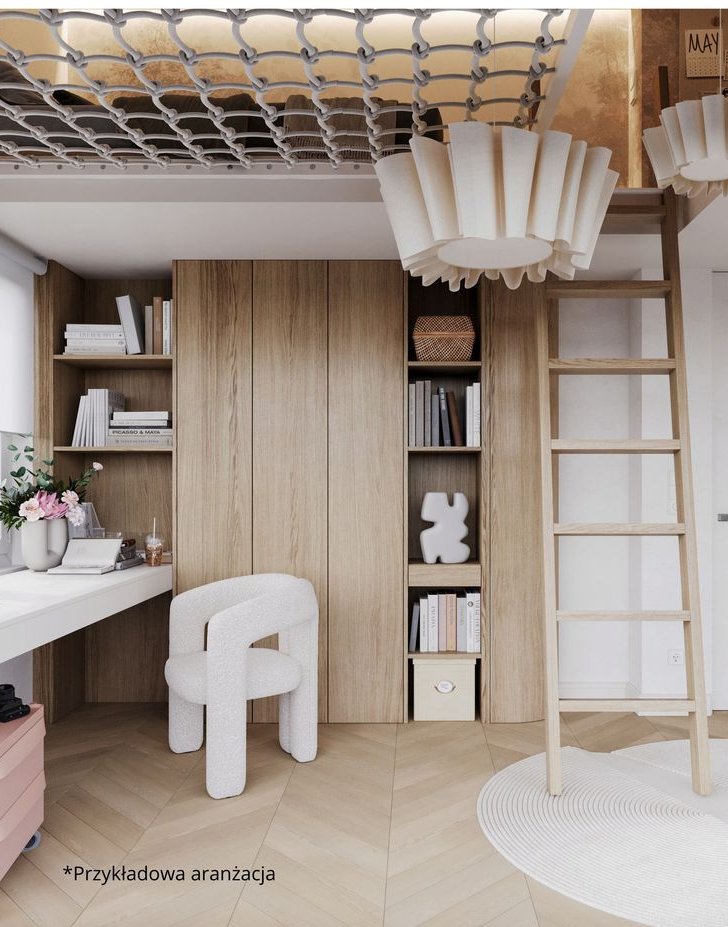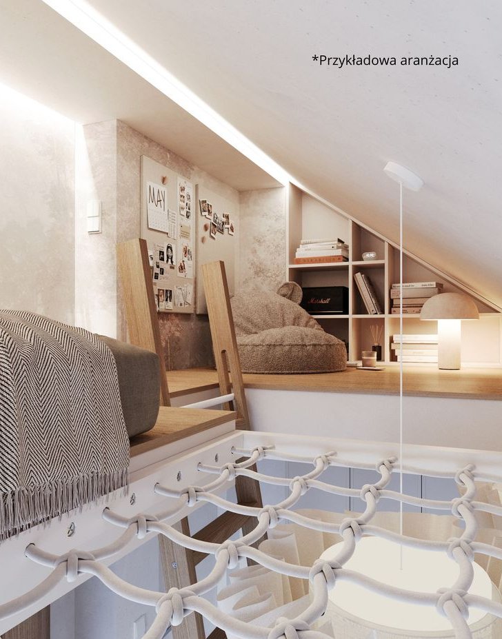* Duży, otwarty salon połączony z widnym aneksem kuchennym (23,03 m²), idealny do codziennego życia.