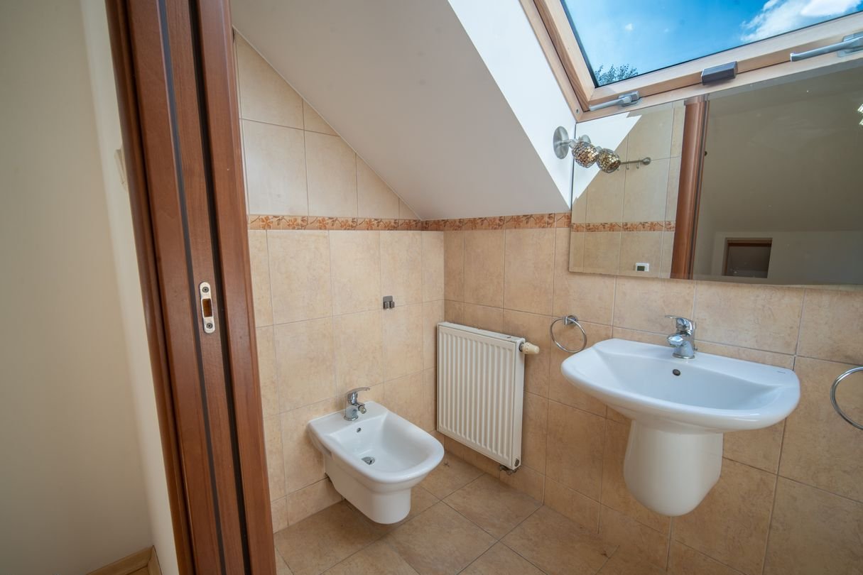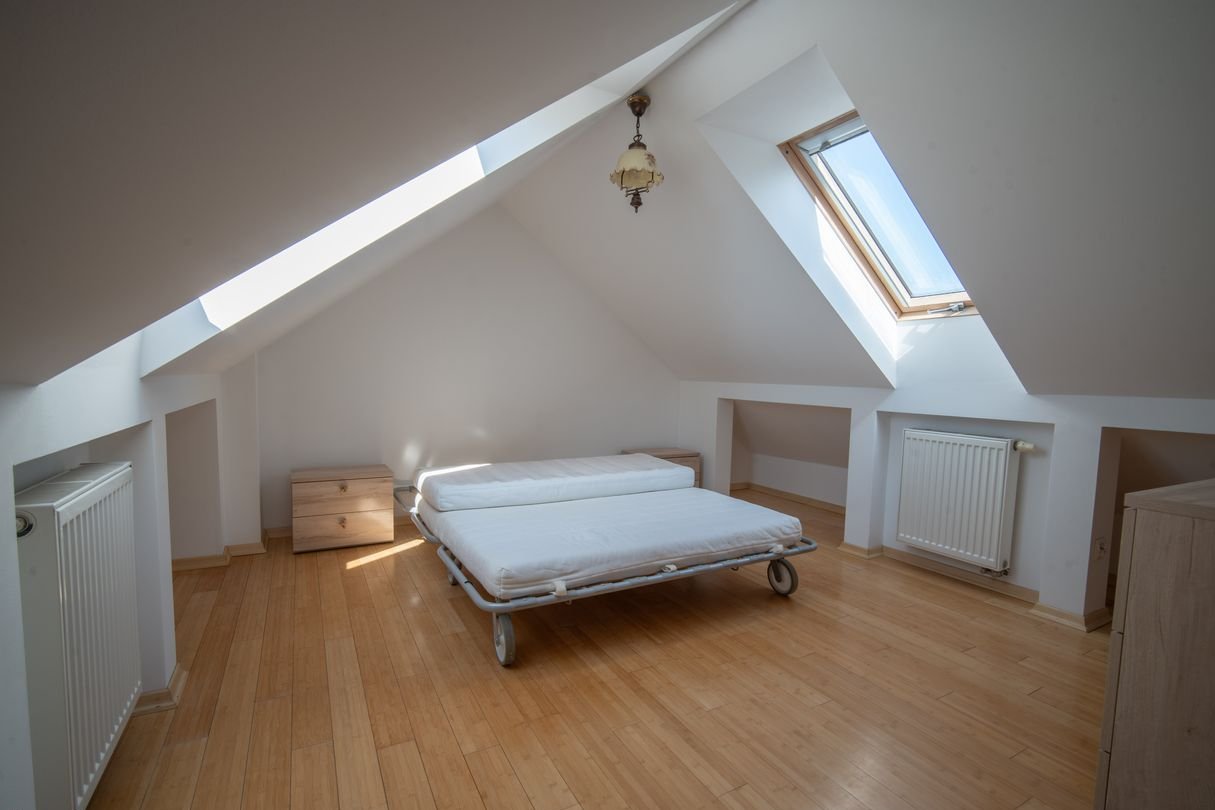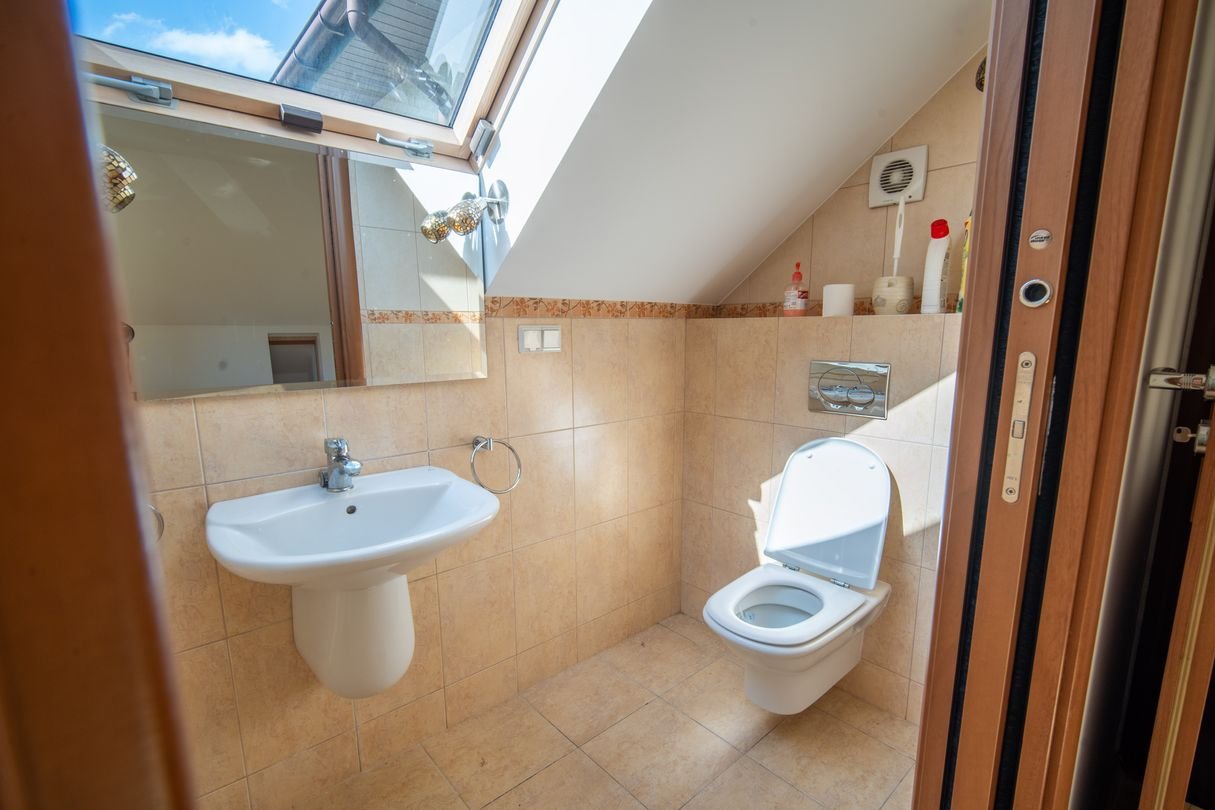 Pokój z łazienką i schowkami nad garażem sprawdzi się jako oaza dla nastolatka, sypialnia na piętrze do doskonałe miejsce na biblioteczkę. Kolejna przestrzeń idealnie sprawdzi się na adaptację jako sypialnia dla rodziców lub dwa mniejsze pokoje. Dodatkowo na piętrze oddzielna garderoba i MEGA łazienka z oknem i prysznicem oraz wanną. Pokój na poddaszu to miejsce dla Twoich gości lub pokój dla starszego dziecka.