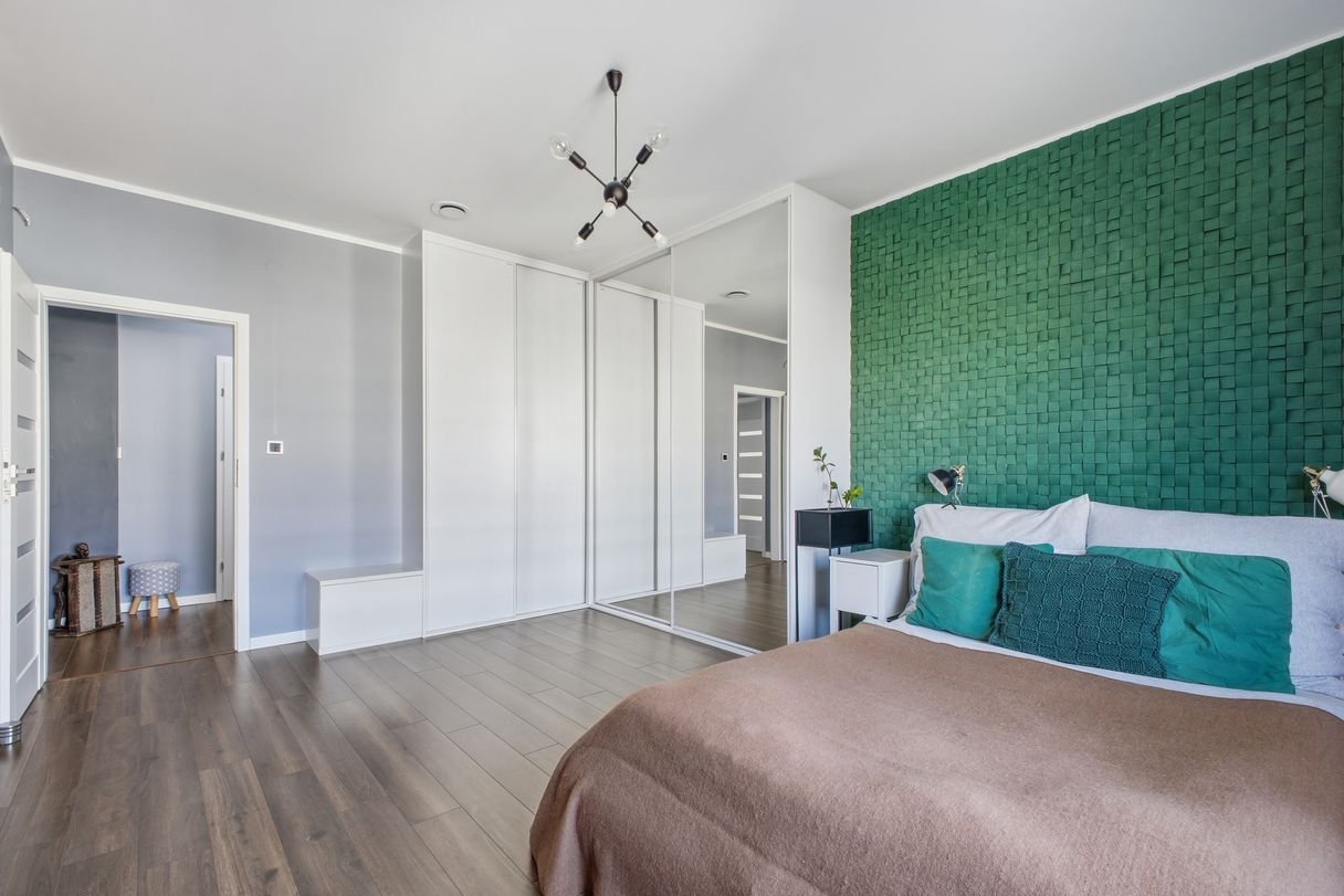 Sypialnia Główna (19,95 m²): Duża sypialnia z szafami w zabudowie wykonanymi przez firmę Komandor.