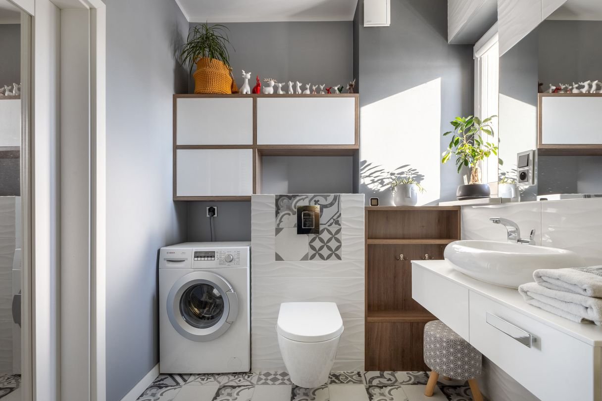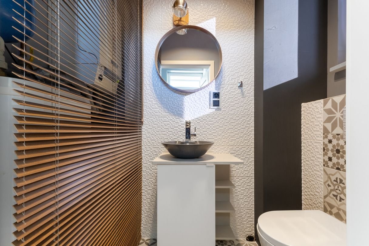 Ogrzewanie: piec gazowy, estetycznie ukryty w WC na dole za drewnianą roletą.