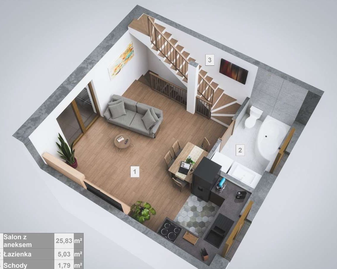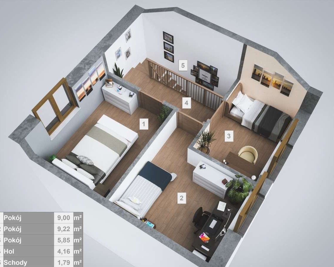 Poddasze: posadzka,tynki gipsowe, rozprowadzenie instalacji centralnego ogrzewania oraz wyprowadzenie instalacji wodnej