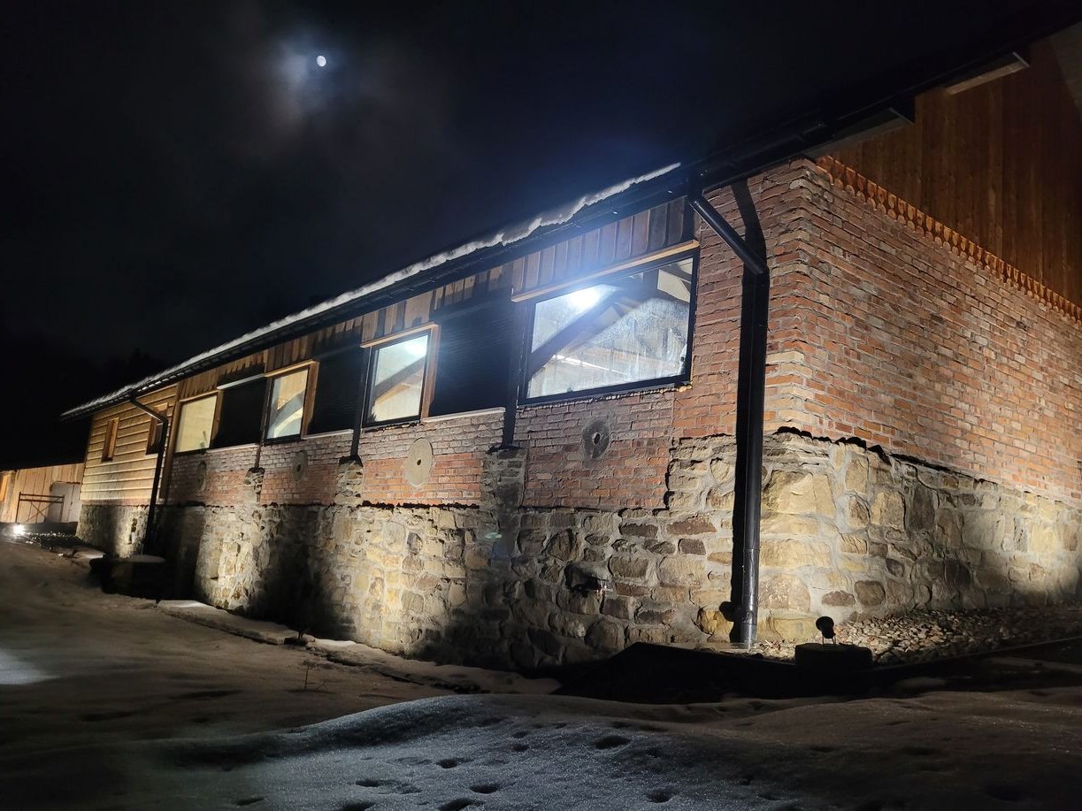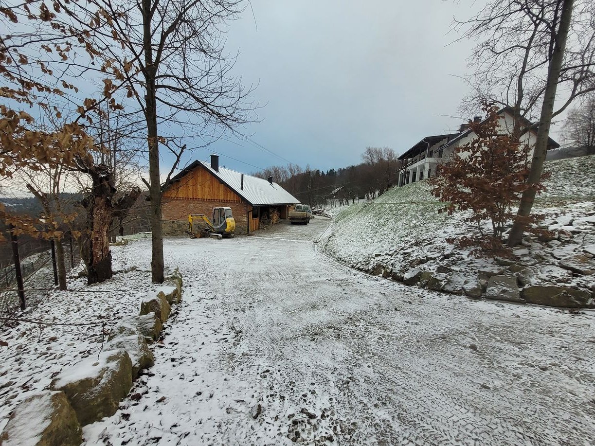 Dom z Budynkiem gospodarczym o wymiarach 24x8 podpiwniczony (czesc piwnic odrestaurowana po istniejacym budynku)wykorzystana ogromna ilosc kamienia bar w piwnicy oraz oddzielna wiata z jacuzzi łazienkami i planowaną sauną