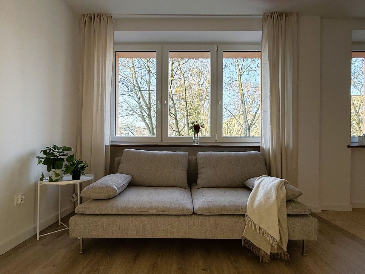 Okna z salonu i kuchni wychodzą na zadrzewiony skwerek, dzięki czemu latem nie jest gorąco.