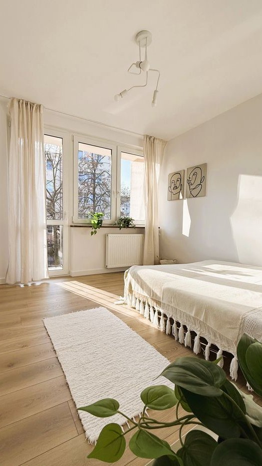 Mieszkanie jasne i widne, duże szerokie okna wpuszczają dużą ilość światła. Okna skierowane na południe i zachód. Wokół niska zabudowa, duże odległości między blokami, pełno zieleni.