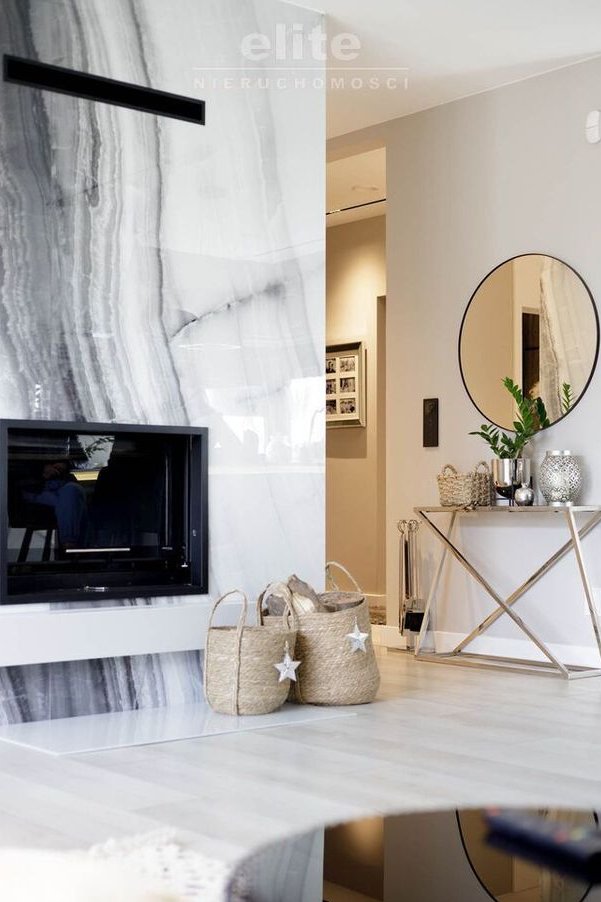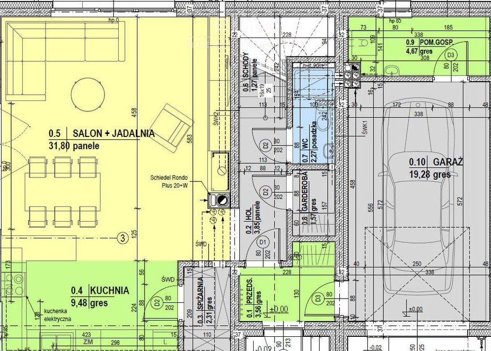 Parter: przestronny salon z kominkiem 31,08m2 z kuchnią 9,48m2, łazienka 2,27m2, garderoba 1,57m2, przedsionek 3,56m2, holl 3,85m2, spiżarnia 2,3m2.