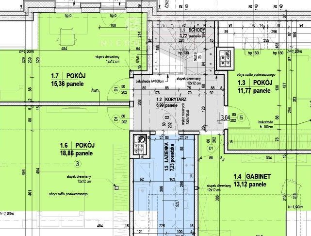Piętro: 4 pokoje 18,86m2, 15,36m2, 13,12m2, 11,77m2 + łazienka z wc 7,23m2, korytarz 7m2