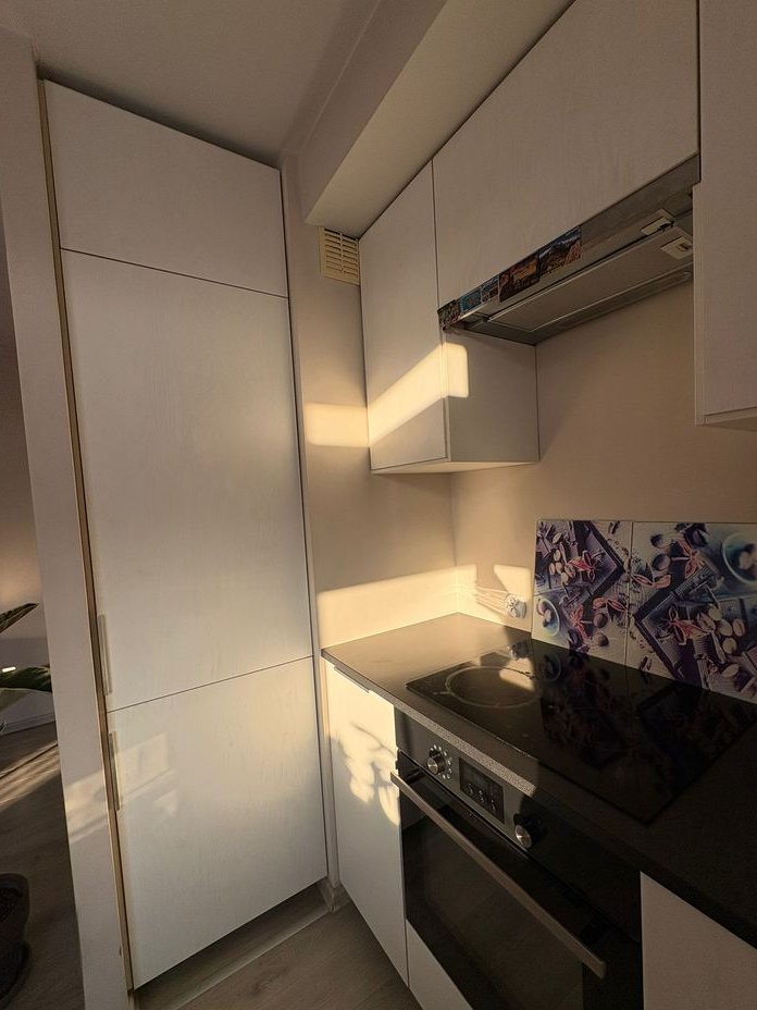 Kuchnia wyposażona w meble wykonane na wymiar, sprzęty AGD (lodówka, piekarnik, zmywarka, płyta elektryczna).