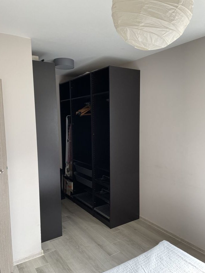 W sypialni znajduje się duża garderoba (zabudowa na wymiar), szafka i łóżko.