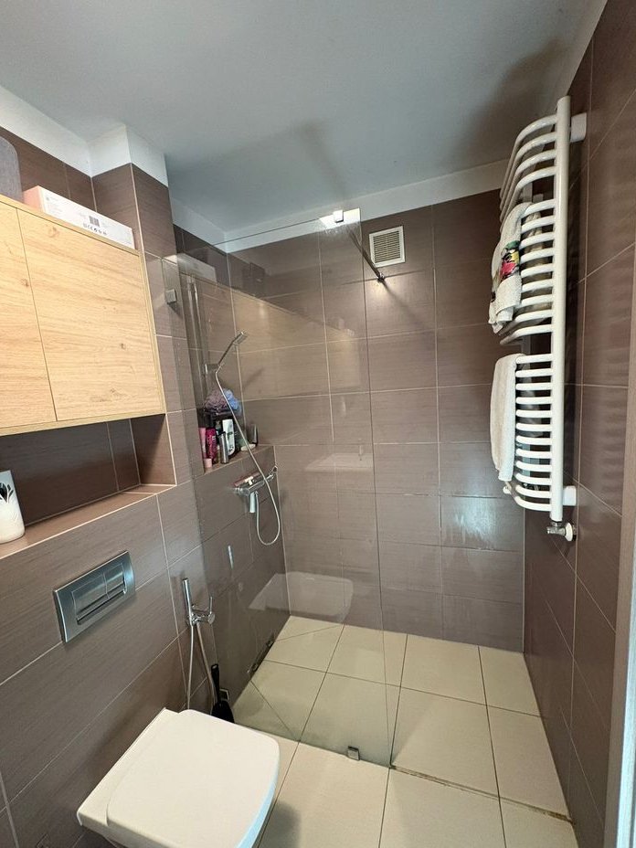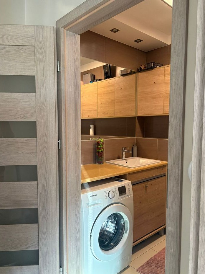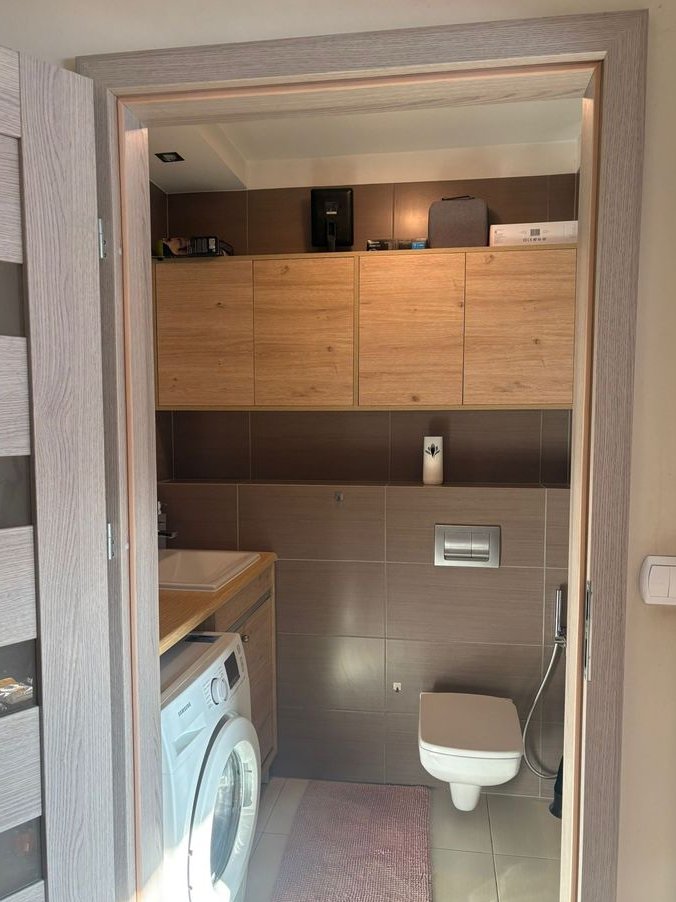 W łazience meble na wymiar, pralka Samsung, prysznic typu walk-in, bidetka przy toalecie.