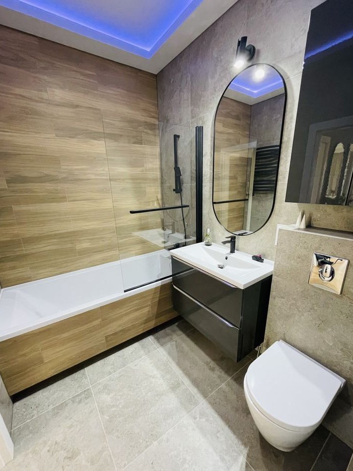 ŁAZIENKA o powierzchni 5 m2 z wanną, zabudową oraz pralką