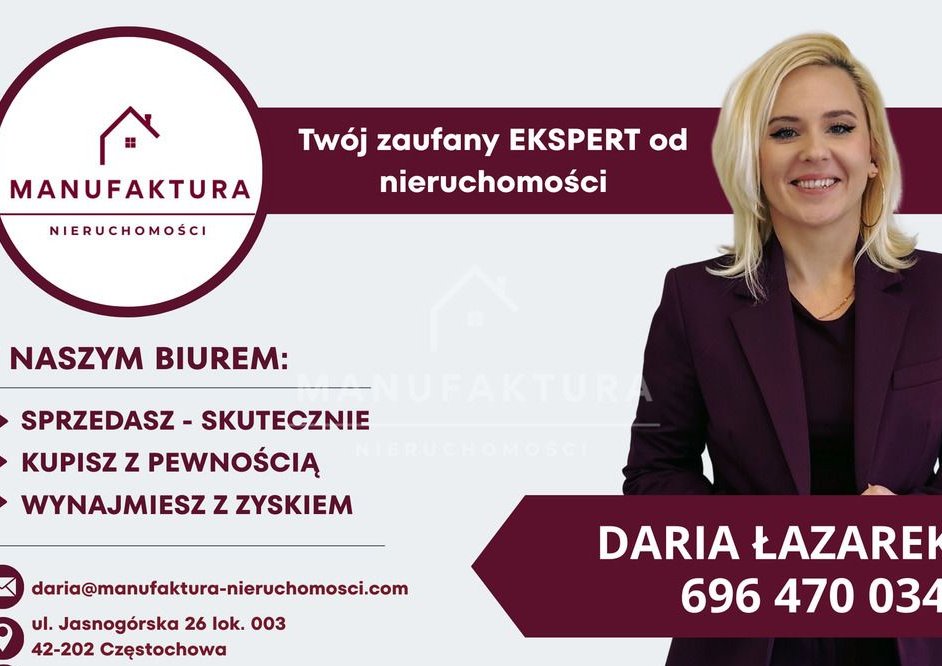 Informacje zawarte w ofercie są sporządzone na podstawie oględzin nieruchomości, a także danych uzyskanych od właściciela. Oferta nieruchomości ma charakter wyłącznie informacyjny, może podlegać aktualizacji oraz nie stanowi oferty handlowej w rozumieniu art. 66 Kodeksu Cywilnego.