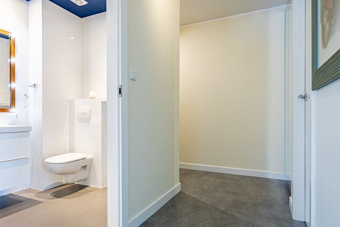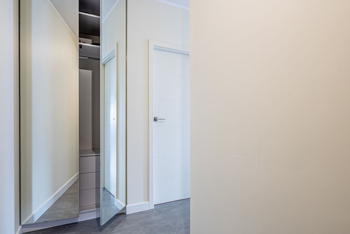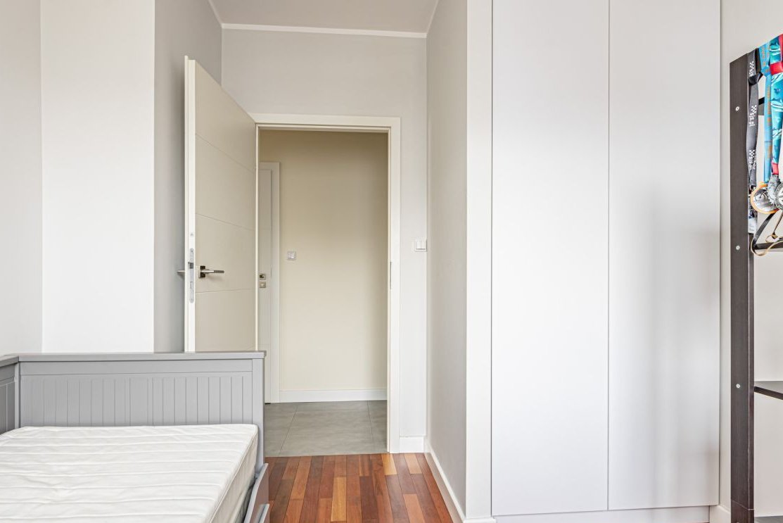 Wejście prowadzi do przestronnego korytarza ok. 7 m², z lustrzaną szafą garderobianą. Po lewej stronie korytarza znajdują się dwie jasne sypialnie ok. 10m² i 11m², w tym jedna również z wbudowaną szafą. Po prawej stronie łazienka ok. 5m² z dużym prysznicem typu walk-in. Na końcu korytarza słoneczny i ustawny salon z aneksem kuchennym ok. 28,5m² oraz wyjściem na duży balkon ok. 9m² od strony południowo-wschodniej.
