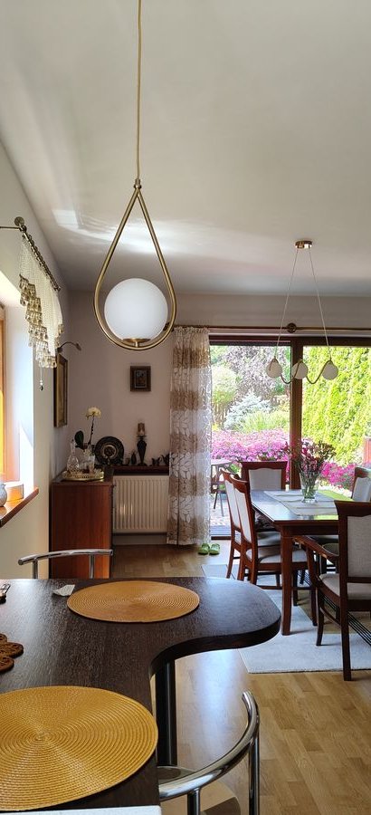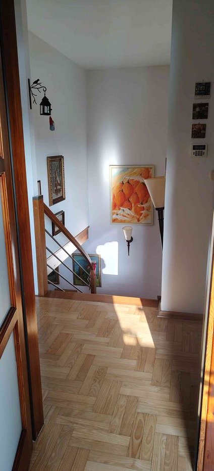 Dom składa się z parteru i piętra oraz garażu w bryle budynku. Pow. mieszkalna to 132 m2, garaż 18 m2 (garaż może być zaadaptowany np. na gabinet lub pomieszczenie gospodarcze). Na parterze bardzo dobrze doświetlony, duży o pow. 42 m2 salon z kominkiem i z otwartą kuchnią, łazienka, wiatrołap z wnęką na pomieszczenie gospodarcze. Z salonu bezpośrednie wyjście na drewniany taras o pow. 15 m2, prowadzący do przestronnego ogrodu. Na piętrze wygodny korytarz , 4 oddzielne i jasne pokoje, łazienka i taras nad garażem z ładnym widokiem i wschodnią wystawą. Na piętro prowadzą szerokie, bardzo wygodne drewniane schody dębowe. Wszystkie pomieszczenia mają wysokość 2,7 m. Wędrujące po domu, przez cały dzień, światło słoneczne i przestrzeń sprawiają wyjątkowy komfort. Dom z wewnętrzną siecią alarmową, obecnie obsługiwaną przez firmę Solid, w oknach parteru zamontowane rolety antywłamaniowe. Przed garażem dodatkowe miejsce postojowe. Dostęp do wszystkich niezbędnych mediów: kanalizacja, gaz, prąd, internet światłowodowy. Bardzo dużymi atutami nieruchomości są: