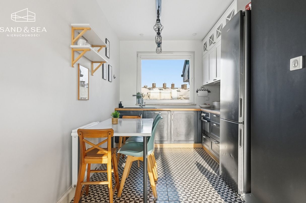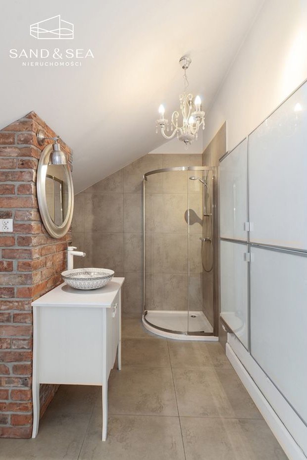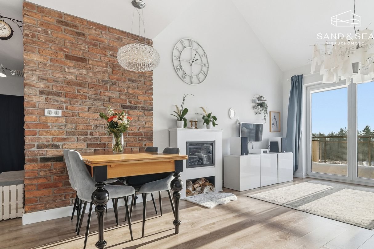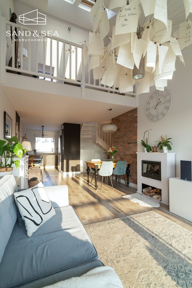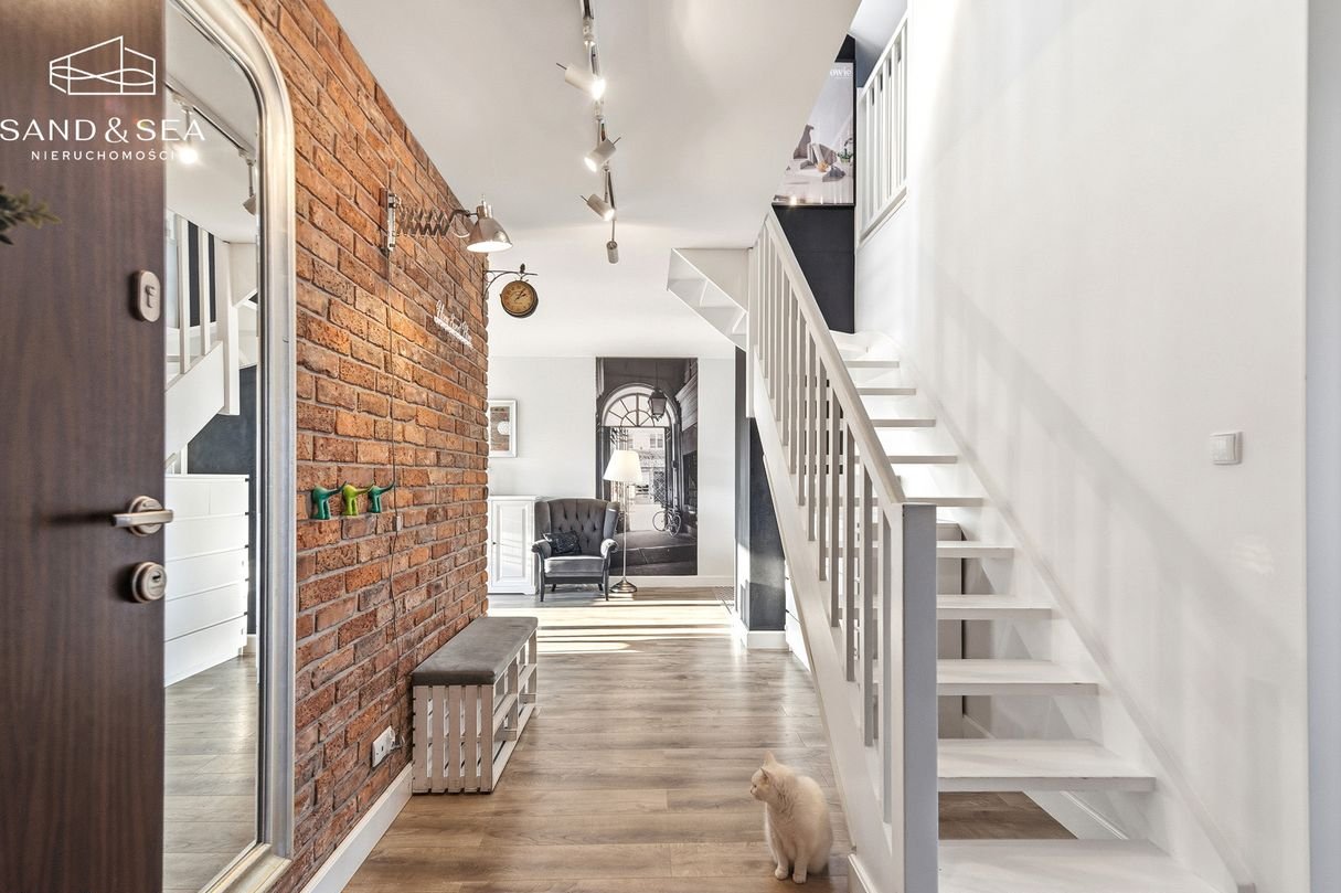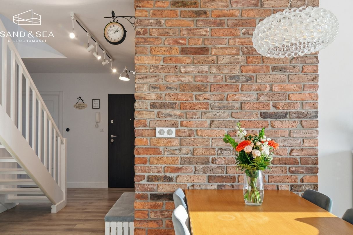 Styl wnętrza nawiązuje do apartamentu typu soft-loft. Naturalna, zabytkowa cegła na ścianach w salonie, korytarzu i górnej łazience nadaje całości charakter i wyróżnia to mieszkanie na tle standardowych ofert. Wnętrza są urządzone w jasnej, nowoczesnej kolorystyce, dzięki czemu przestrzeń jest spójna, lekka i sprzyja codziennemu, komfortowemu spędzaniu czasu.