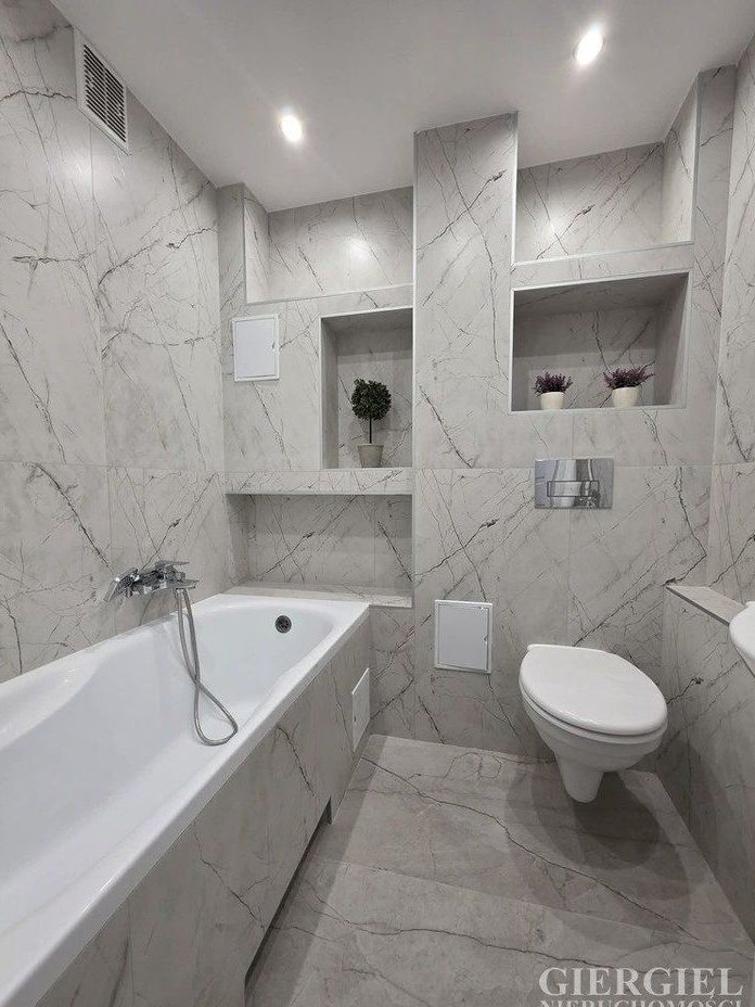 Kuchnia posiada nową zabudowę meblową oraz sprzęt AGD: lodówkę, pralkę oraz kuchenkę gazową. W łazience znajduje się wanna, umywalka oraz toaleta typu kompakt.