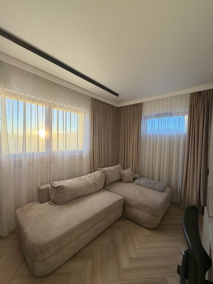 Apartament jest bardzo przestronny i doskonale doświetlony dzięki dużym, panoramicznym oknom, szczególnie w części dziennej.