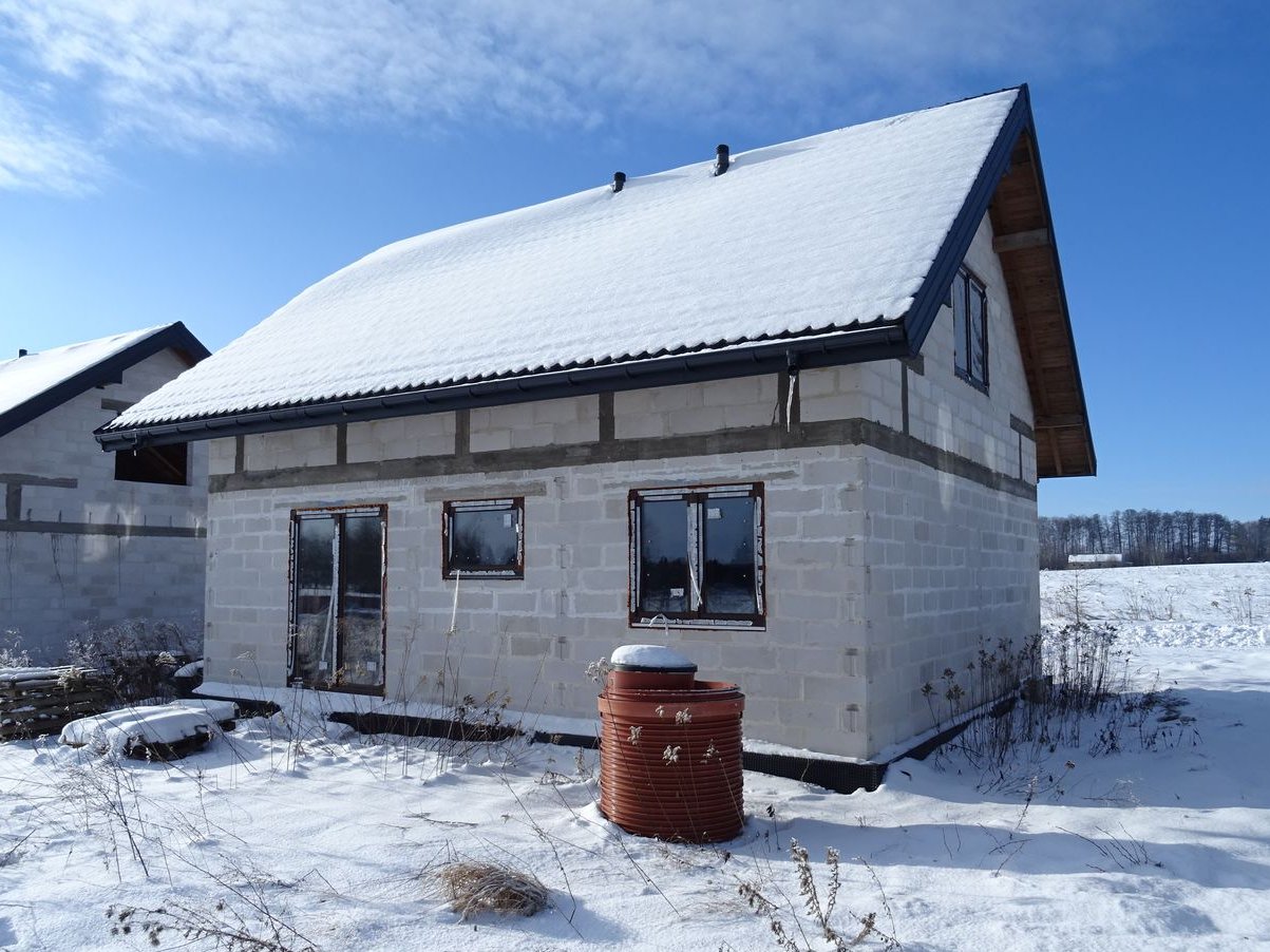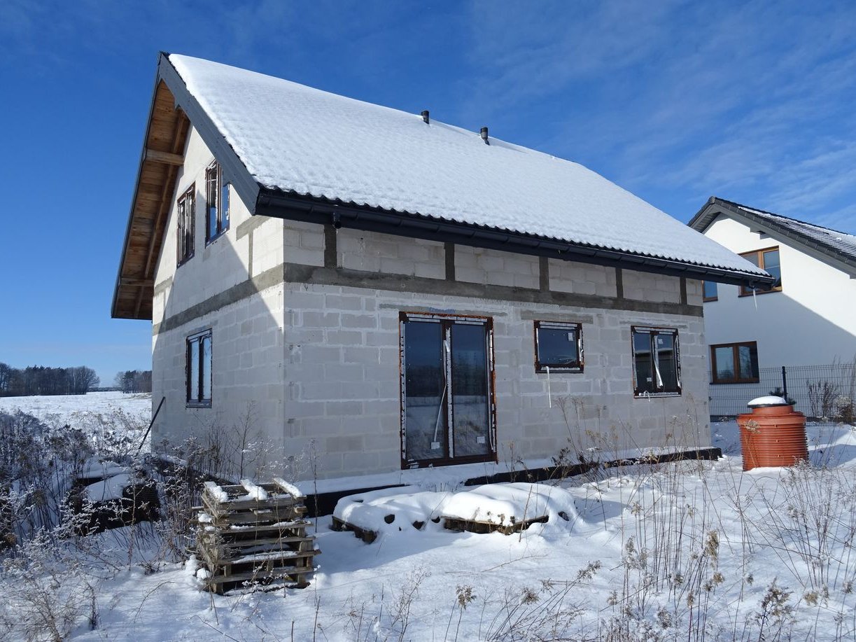 Dom w stanie surowym, na pełnym deskowaniu, pokryty blachodachówką.
