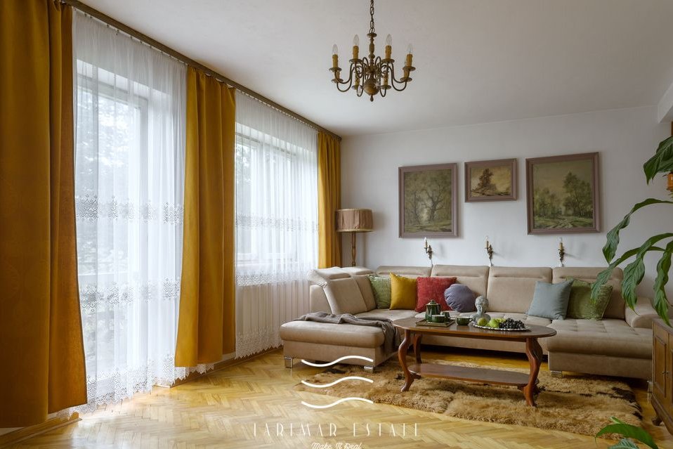 Na podłodze parkiet i deski. Okna drewniane.